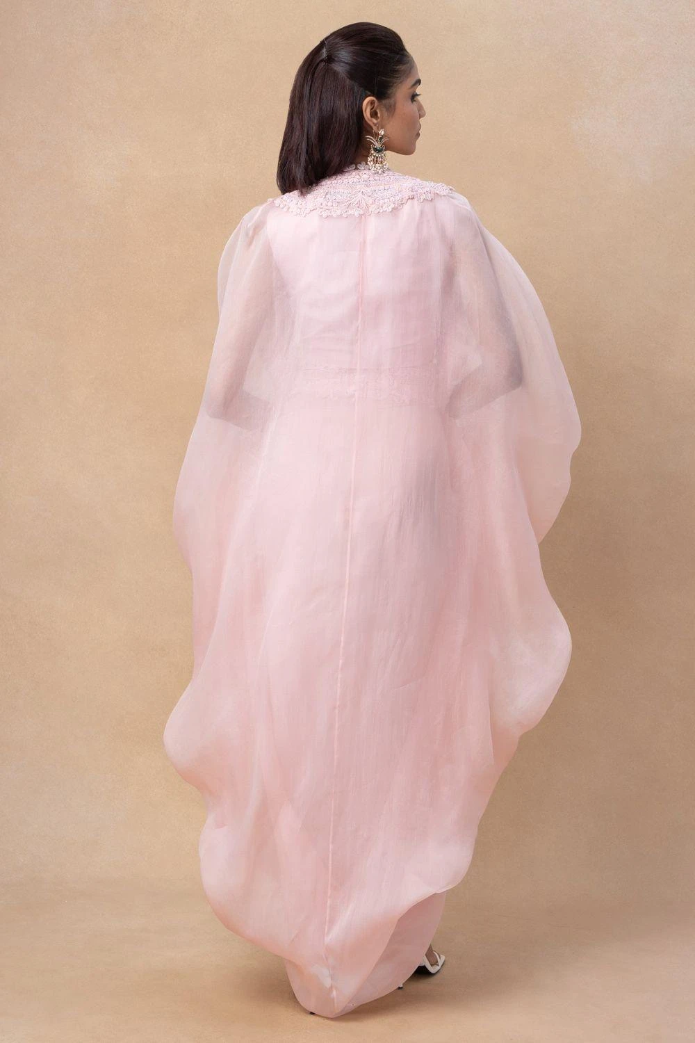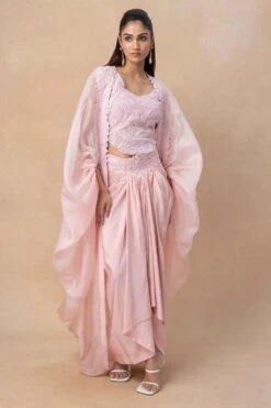 Contemporize your ethnic closet with this super chic & playful set. It features an embroidered cape paired with a top & a draped skirt. Adorn a pair of statement earrings and a clutch to complete the look.