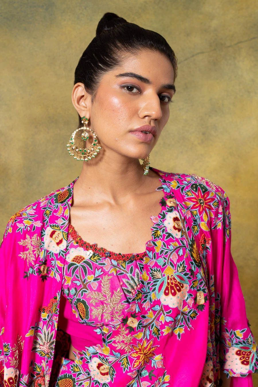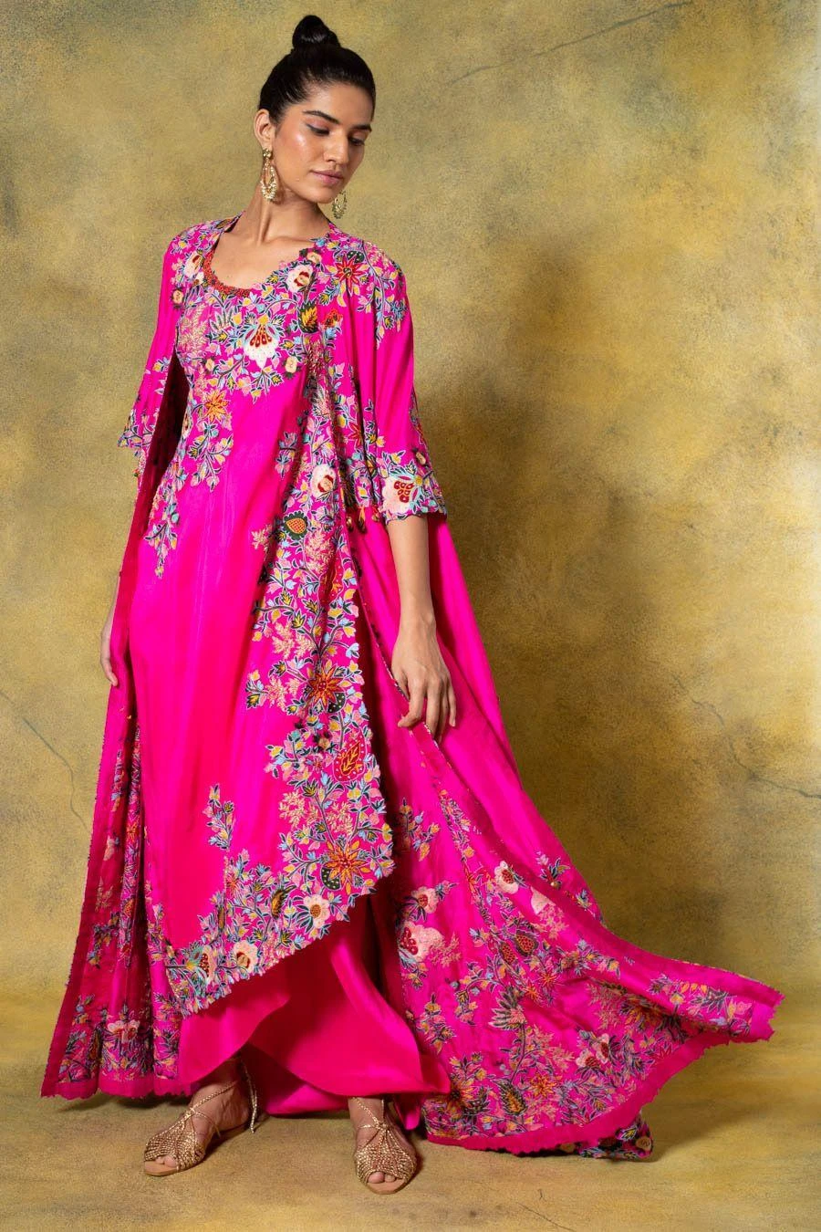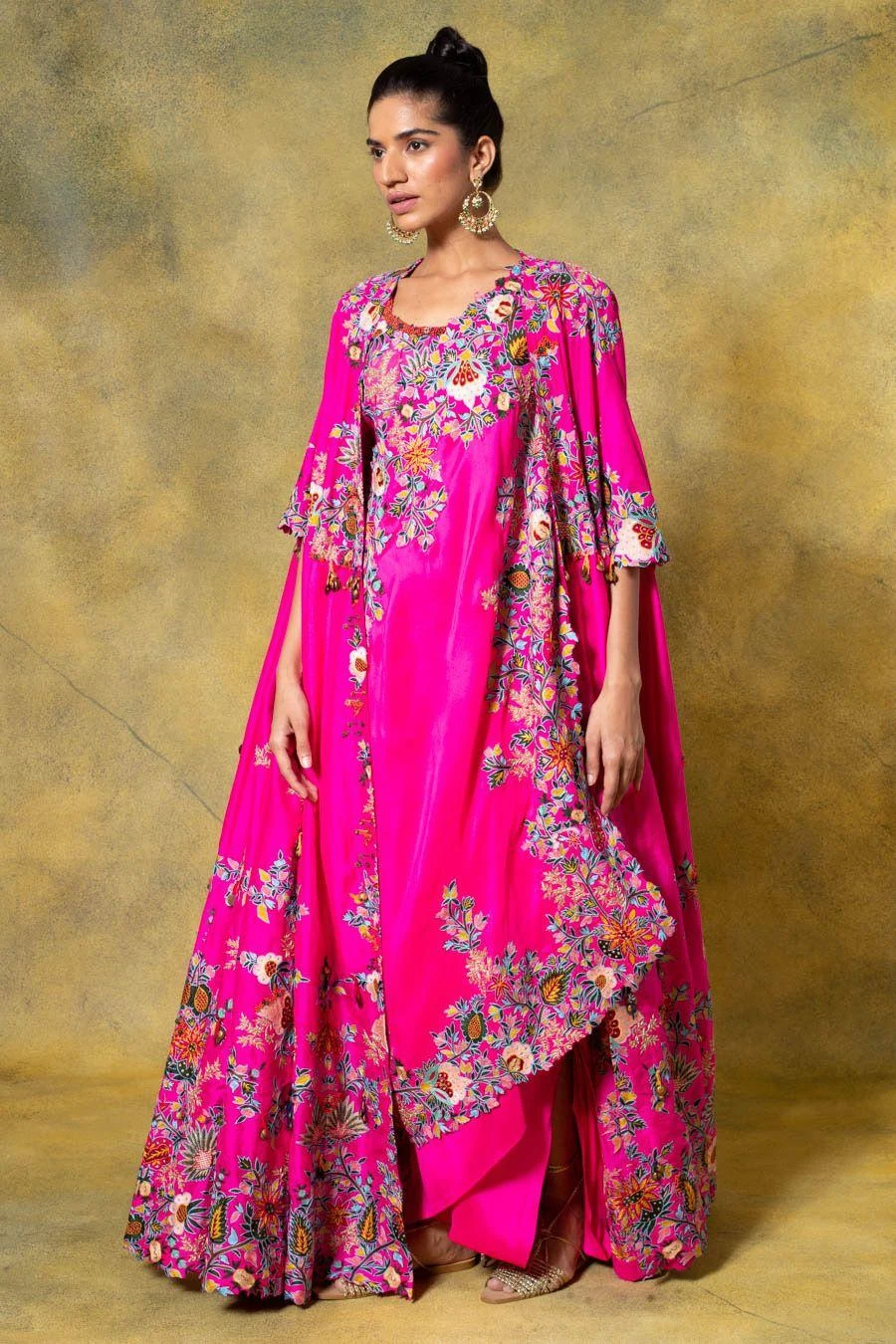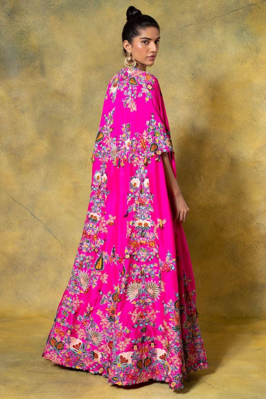 Look sartorially savvy with this cape set. Meticulously fashioned from sumptuous silk, this set showcases a lavishly ornamented cape, perfectly complemented by a gracefully draped skirt, a stylish bustier, and an equally versatile drape.