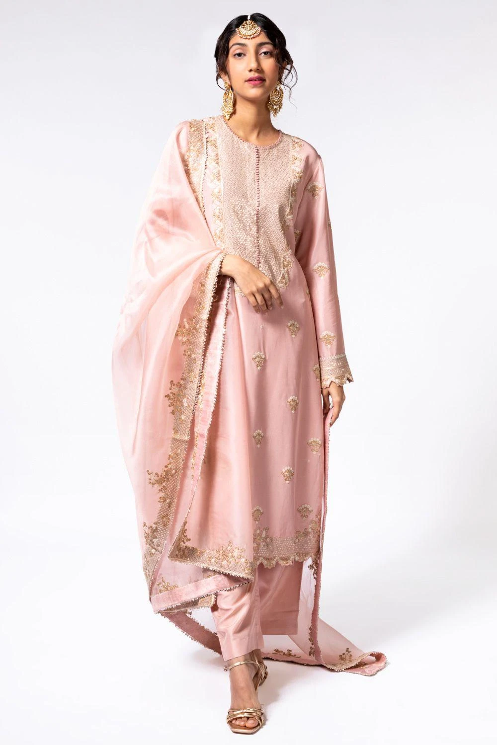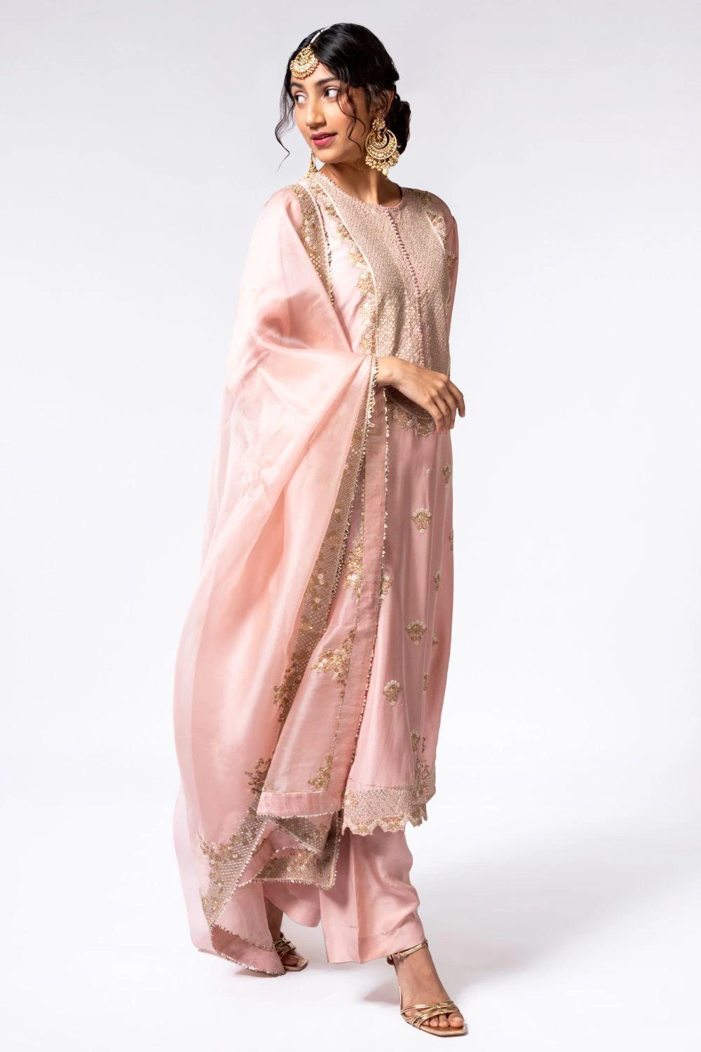 Nothing can beat the timelessness of a classic kurta set. Made in luxe silk, the kurta is enhanced with intricate work. It comes along with a pair of matching pants and a silk organza dupatta.