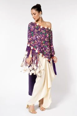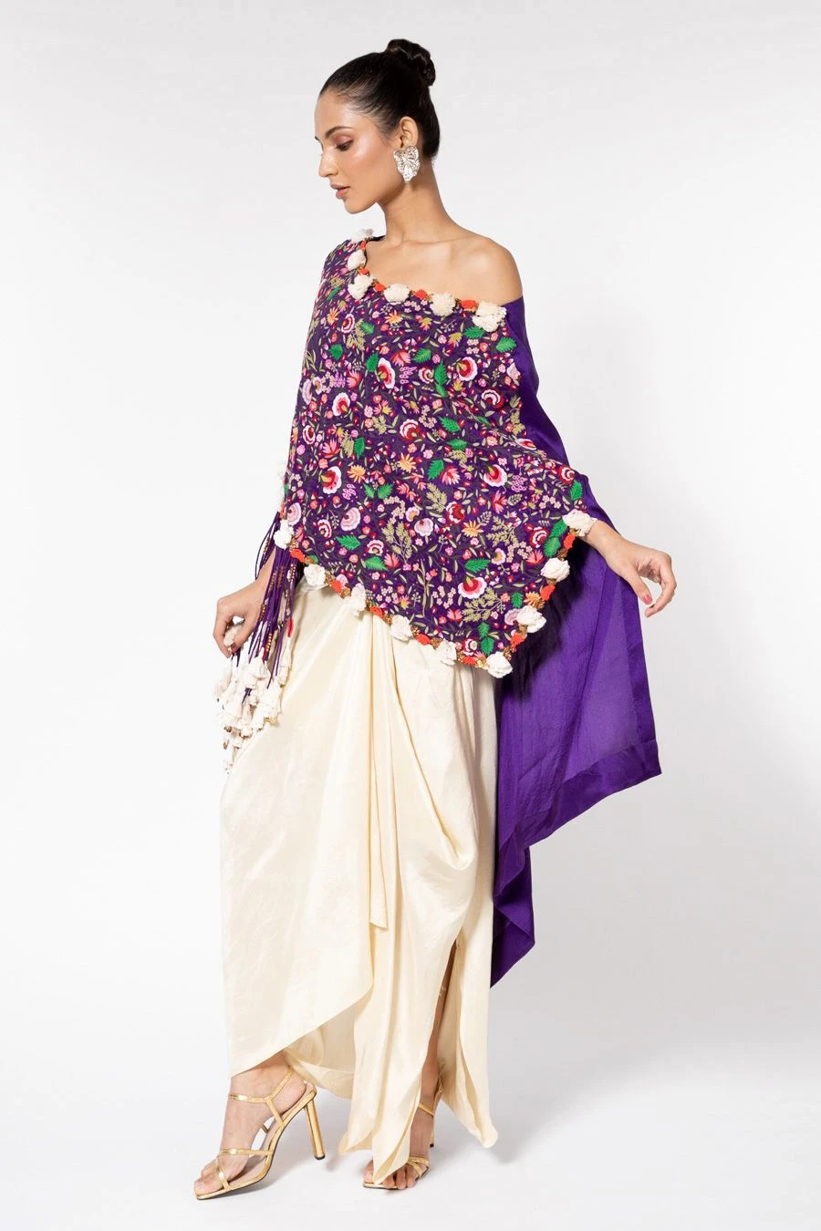Take the center stage in this eclectic purple cape set. It features a draped skirt woven in silk fabric, paired with a heavily embroidered cape. Adorn a statement choker with this look for a sangeet party.