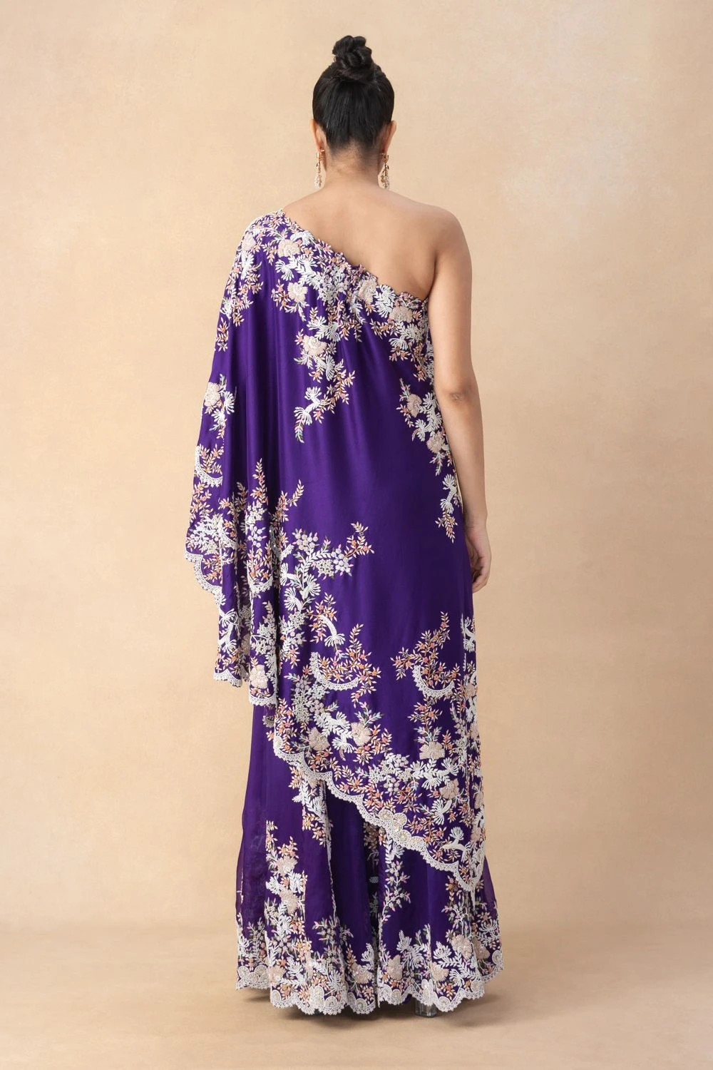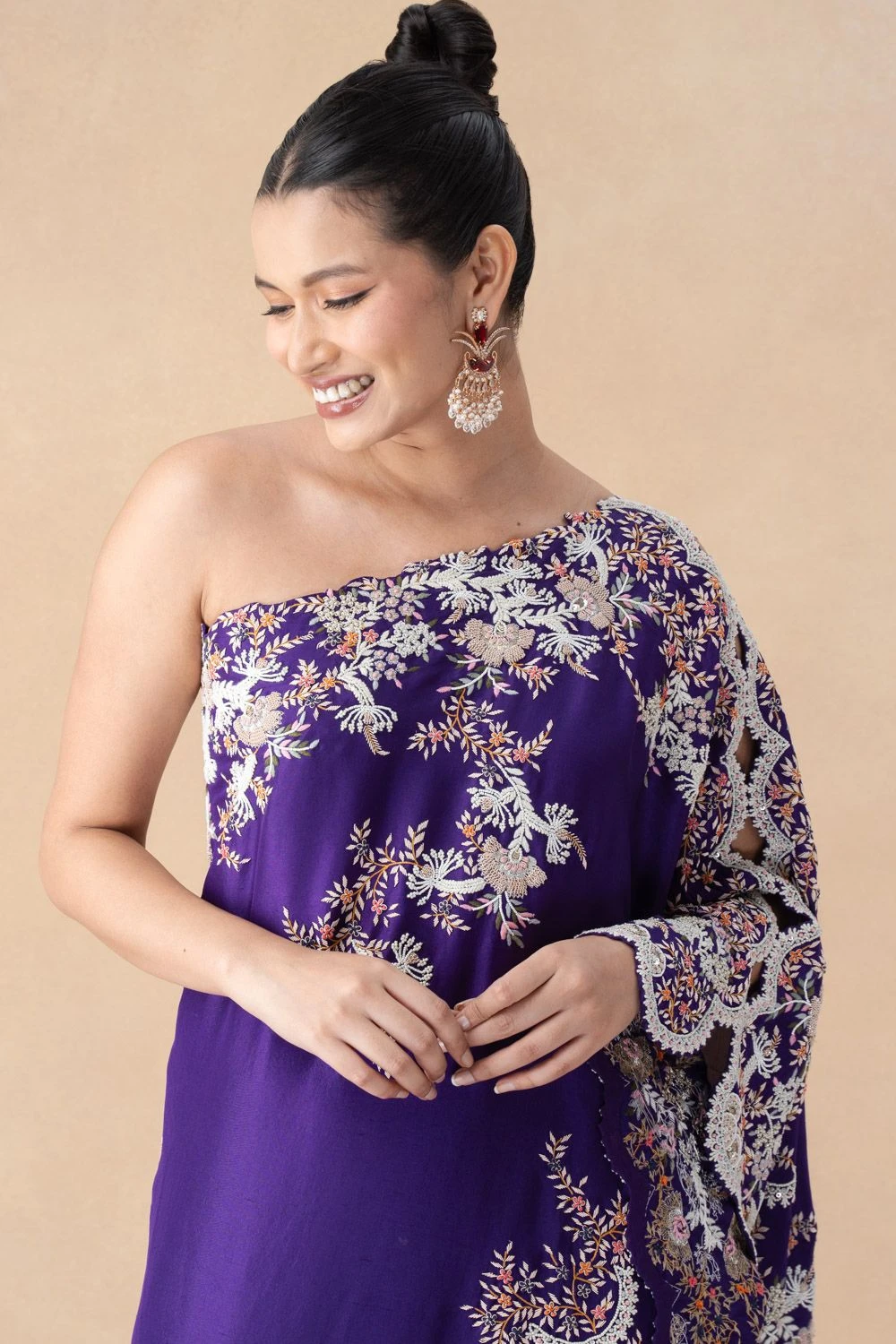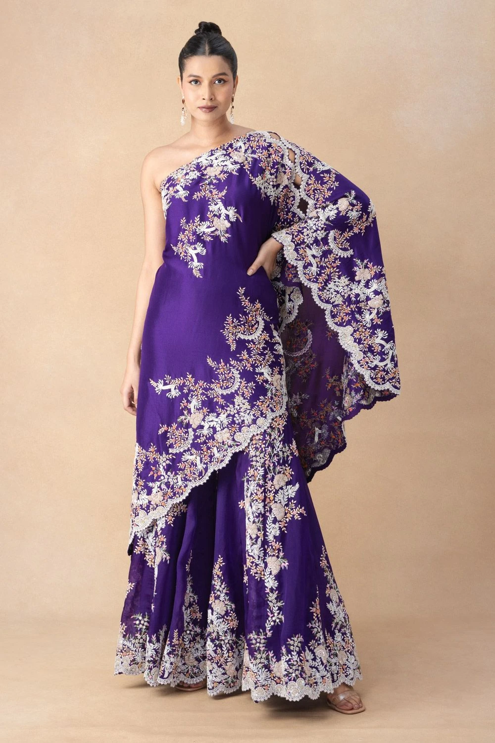 Contemporize your ethnic closet with this super chic & playful set. It features an embroidered one shoulder cape style tunic, paired with equally versatile embellished sharara pants. Adorn a pair of statement earrings to complete the look.
