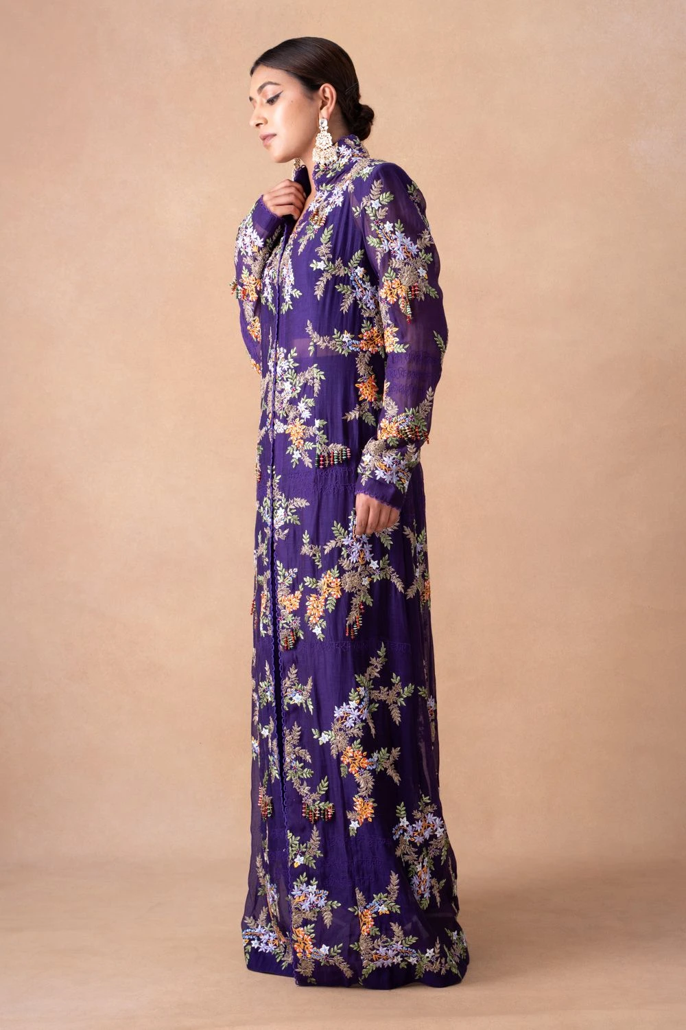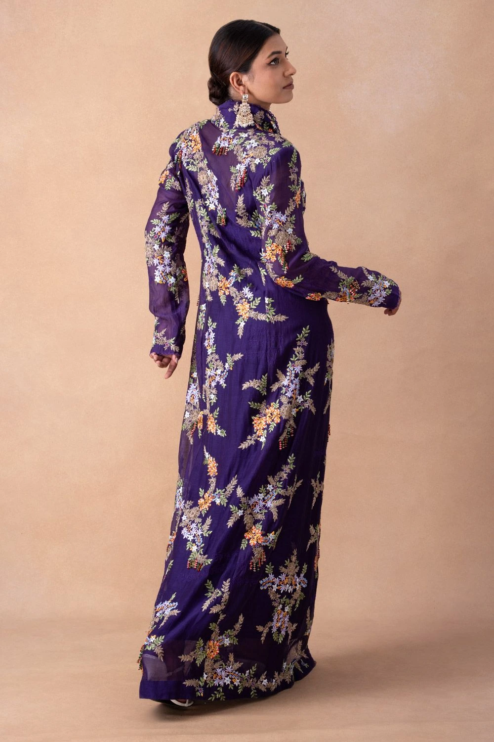 Radiate sophistication in this floral embroidered long jacket-skirt set! Crafted in luxurious silk, featuring a stunning long jacket, bustier & skirt, it’s ideal for formal events or elegant gatherings where timeless grace meets striking style.