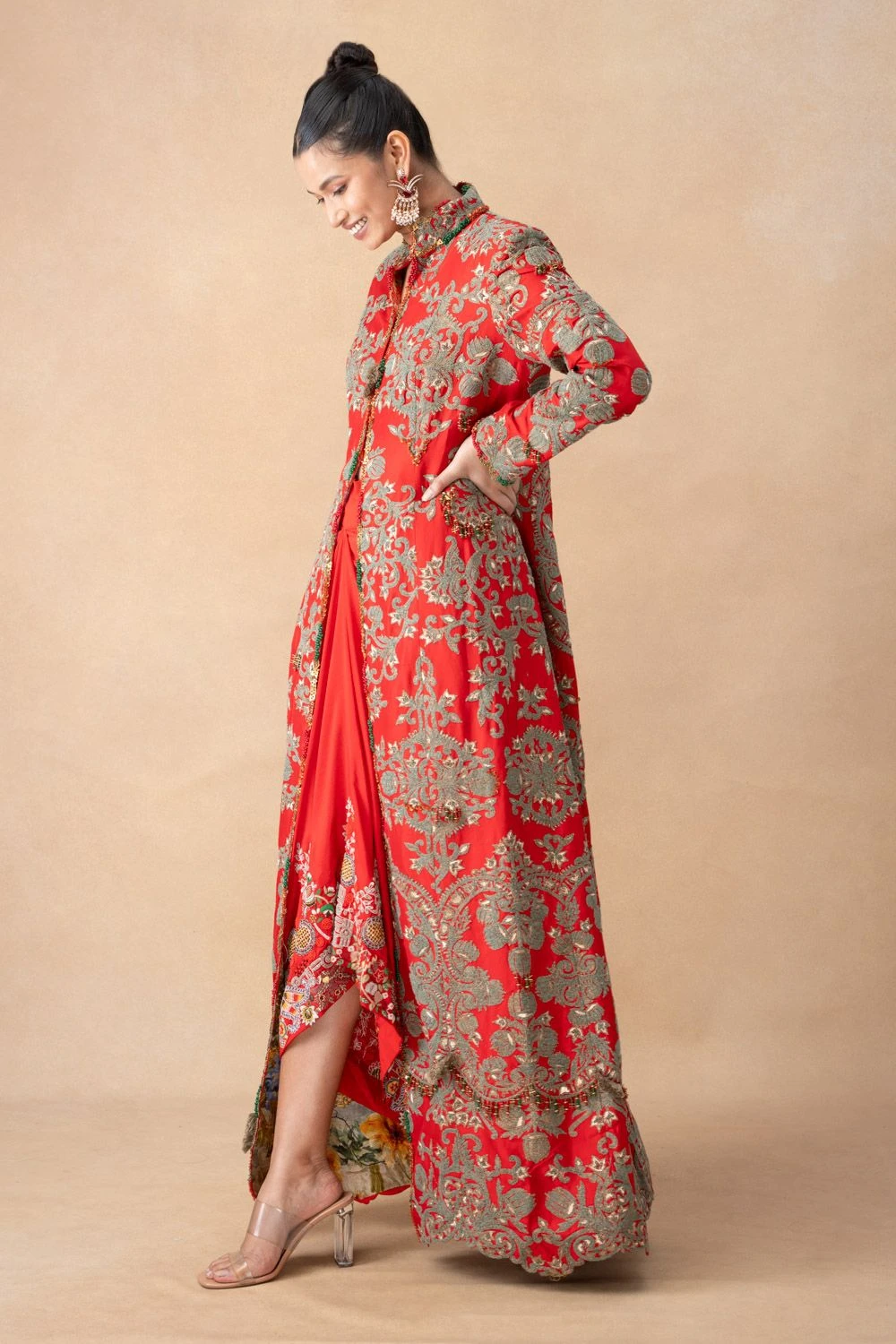 Radiate sophistication in this red floral embroidered long coat-skirt set! Crafted in luxurious silk, featuring a stunning long coat & skirt, it’s ideal for formal events or elegant gatherings where timeless grace meets striking style.