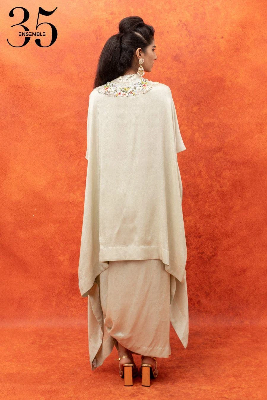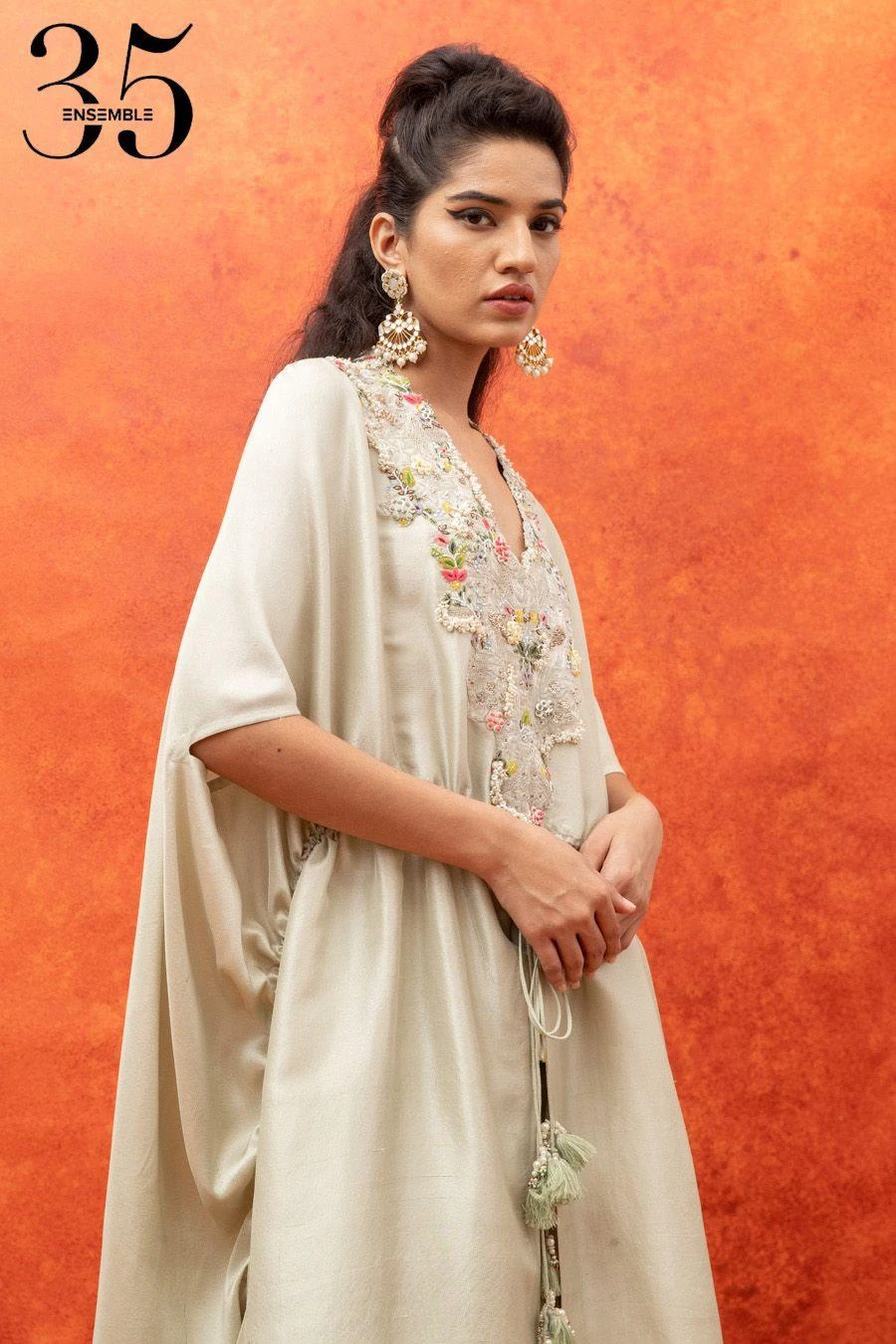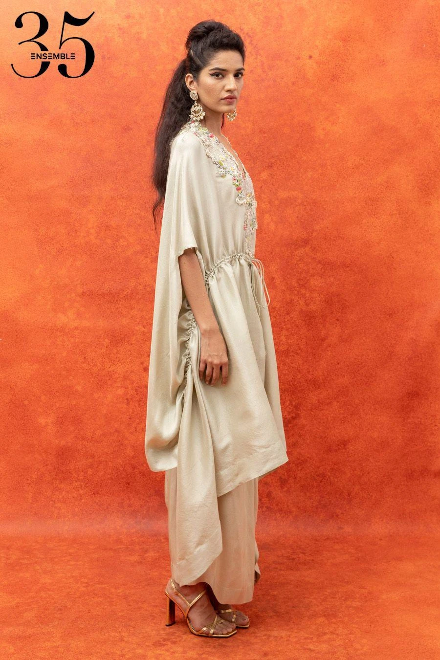 A yearlong celebration of its 35th anniversary telling the story of modern Indian fashion. The perfect amalgamation of style & comfort, this set is perfect for pre-wedding festivities. It features an embroidered, drawstring kaftan with a skirt.