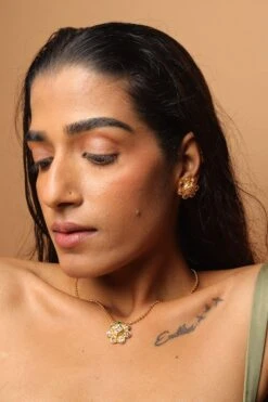Immerse yourself in the splendour of organic opulence with these enchanting earrings. Meticulously crafted, they showcase the divine essence of nature through an exquisite gold-dipped floral motif, adorned with tastefully encrusted gemstones.