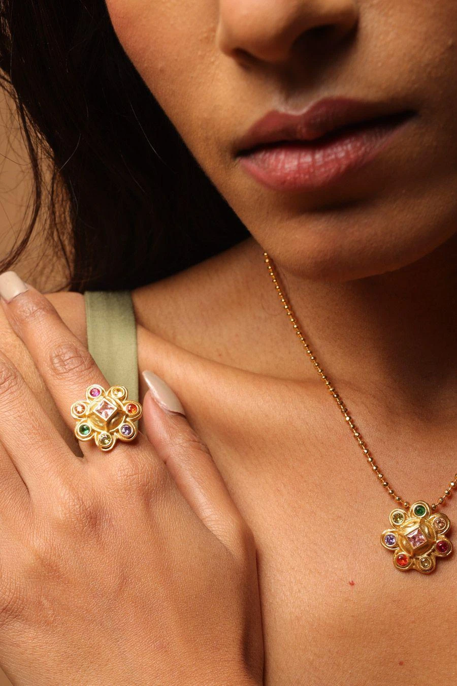 Embark on a whimsical journey of blossoming beauty with this rainbow-hued ring. Delighting the senses, it captures the intricate essence of nature’s fragments, boasting a resplendent gold-dipped flower adorned with exquisitely encrusted stones.