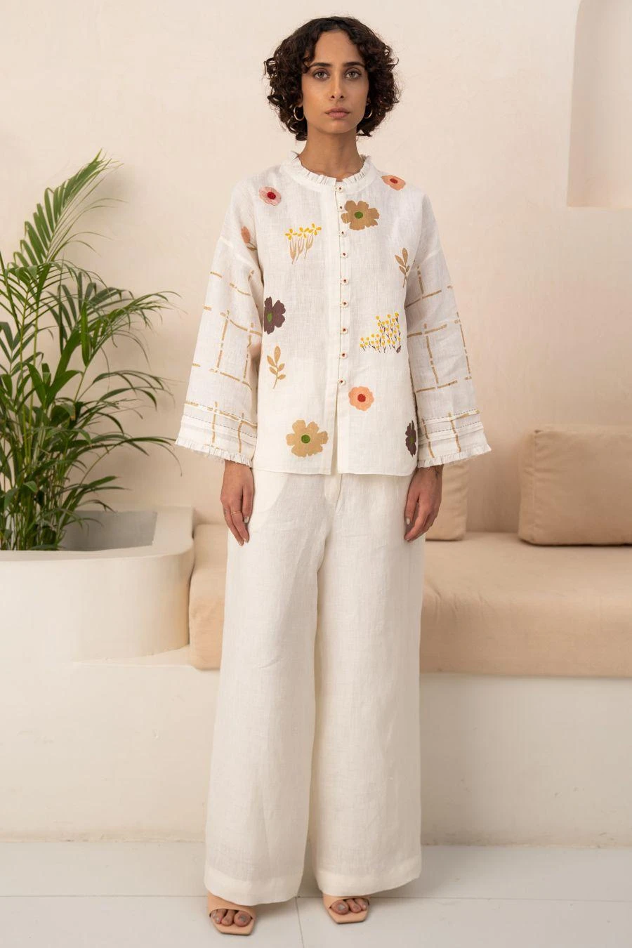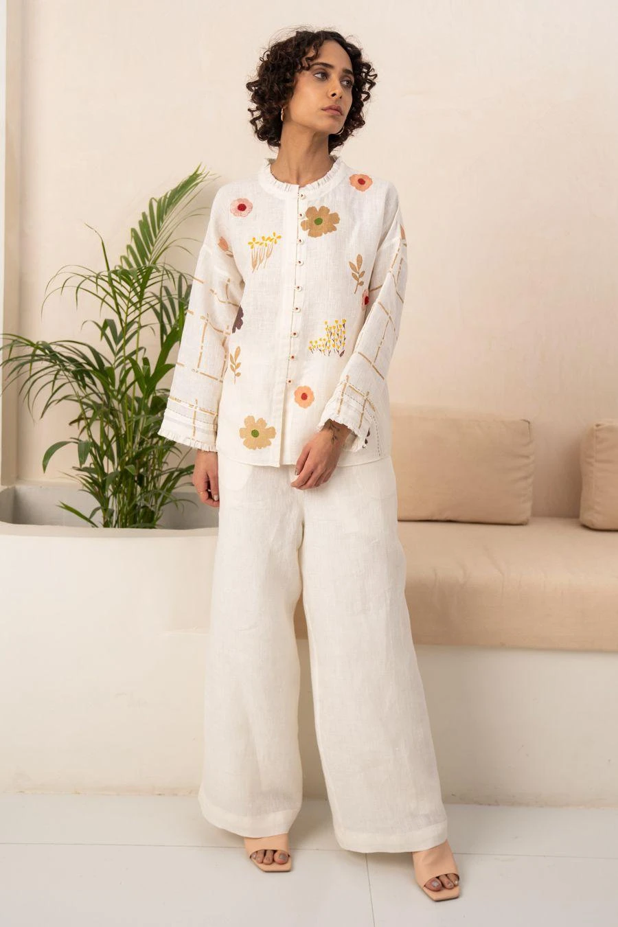 From your work desk to the brunch table & from lounging at home to catching flights, you can always count on this co-ord set. Crafted in linen, this set features a floral embellished top paired with coordinating pants.