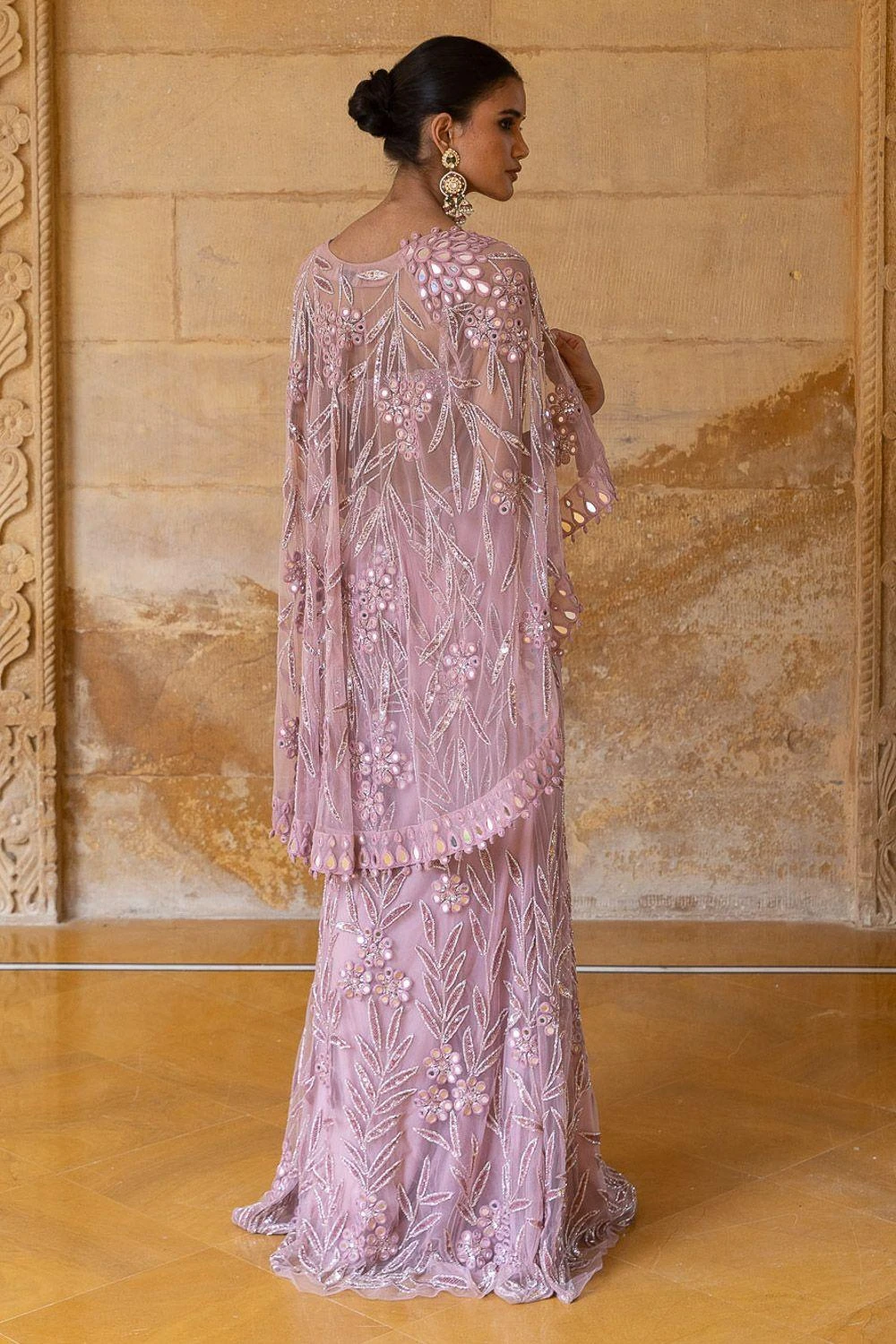Step into opulent elegance with this hand-embroidered cape set. This ensemble is a testament to the perfect fusion of intricate craftsmanship and modern sophistication, setting the stage for a remarkable look.