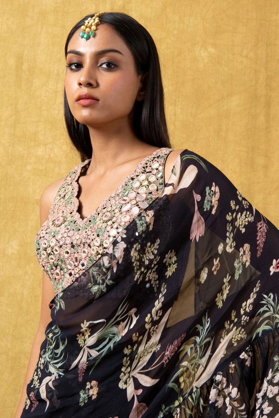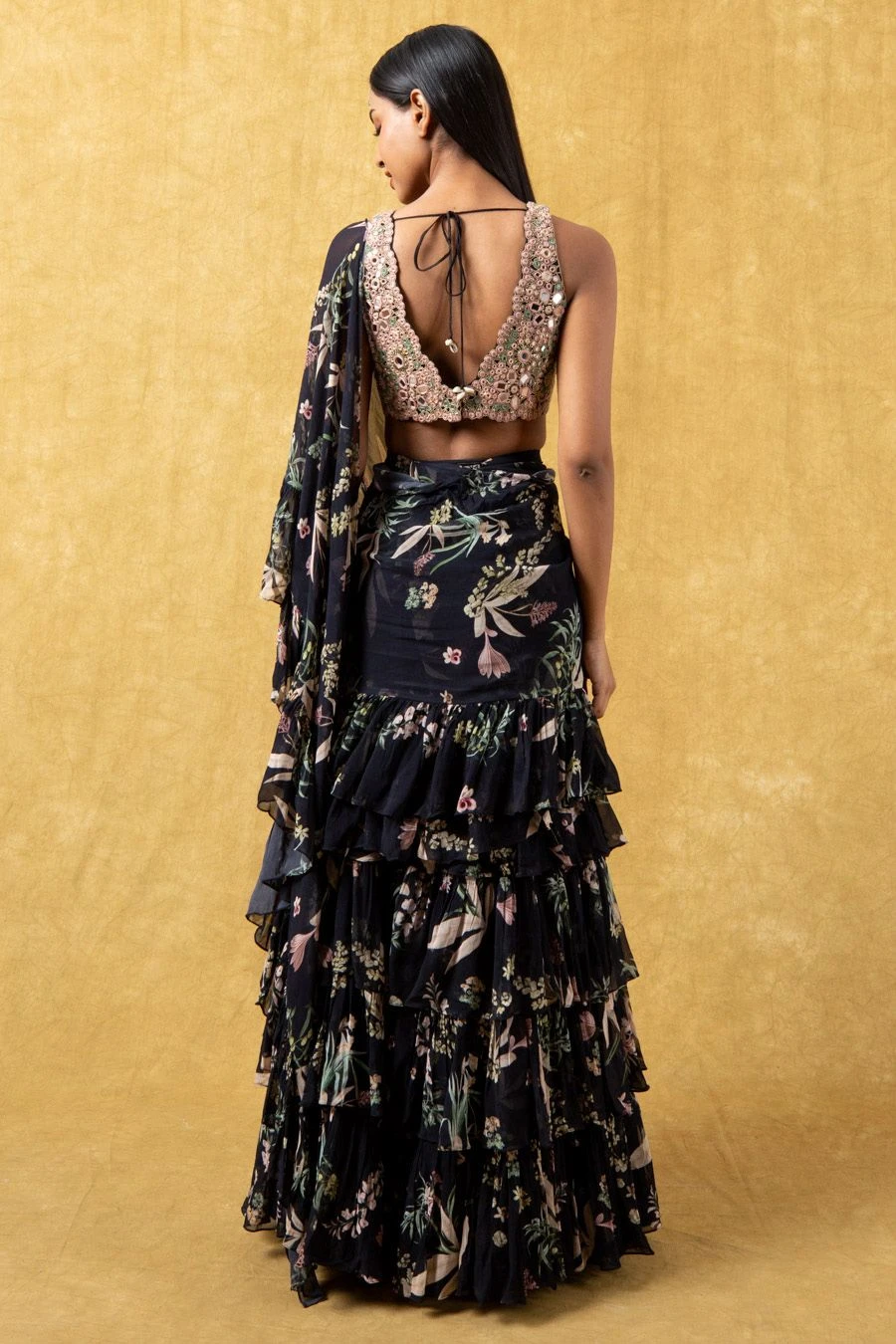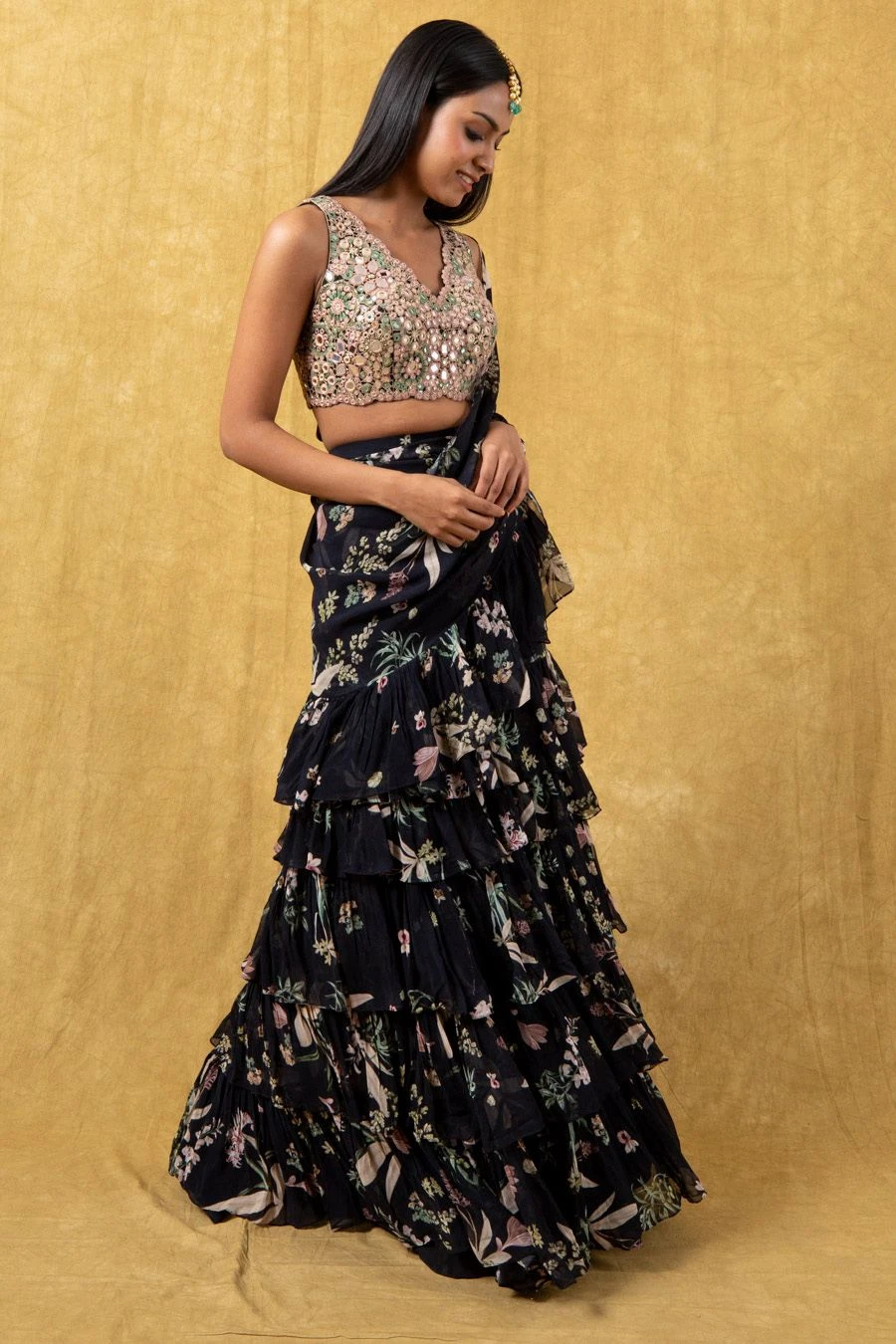 Arpita Mehtas take on the classic sari silhouette is both fun and feminine, making it the perfect choice for the bridesmaid. Crafted in organza & silk, this black floral printed tiered sari is paired with an embellished blouse.