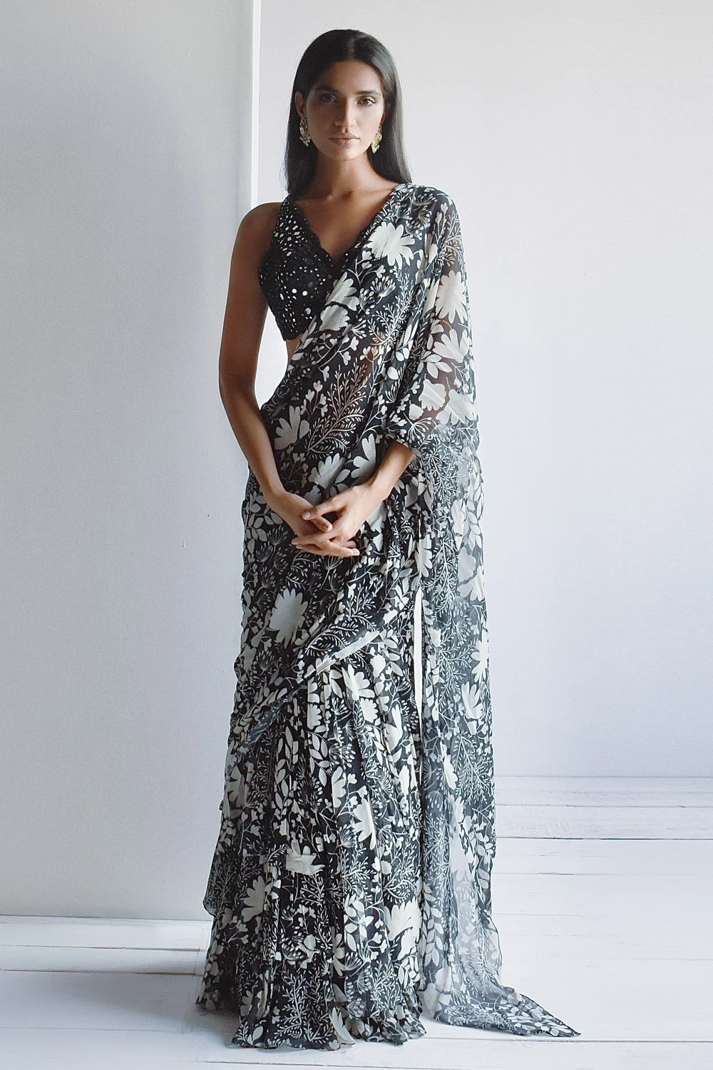 Step into the spotlight with this black floral printed tiered sari paired with an exquisitely embroidered blouse set. Perfect for glamorous evenings and special occasions, this sari set is a testament to refined style and impeccable taste.