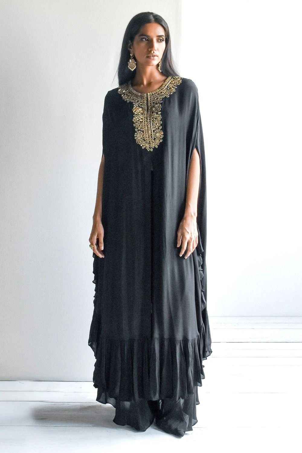 Indulge in the enchanting allure of this black hand-embroidered long cape, exquisitely paired with the elegance of kite pants. This captivating ensemble showcases intricate craftsmanship and a fusion of contemporary and traditional aesthetics.