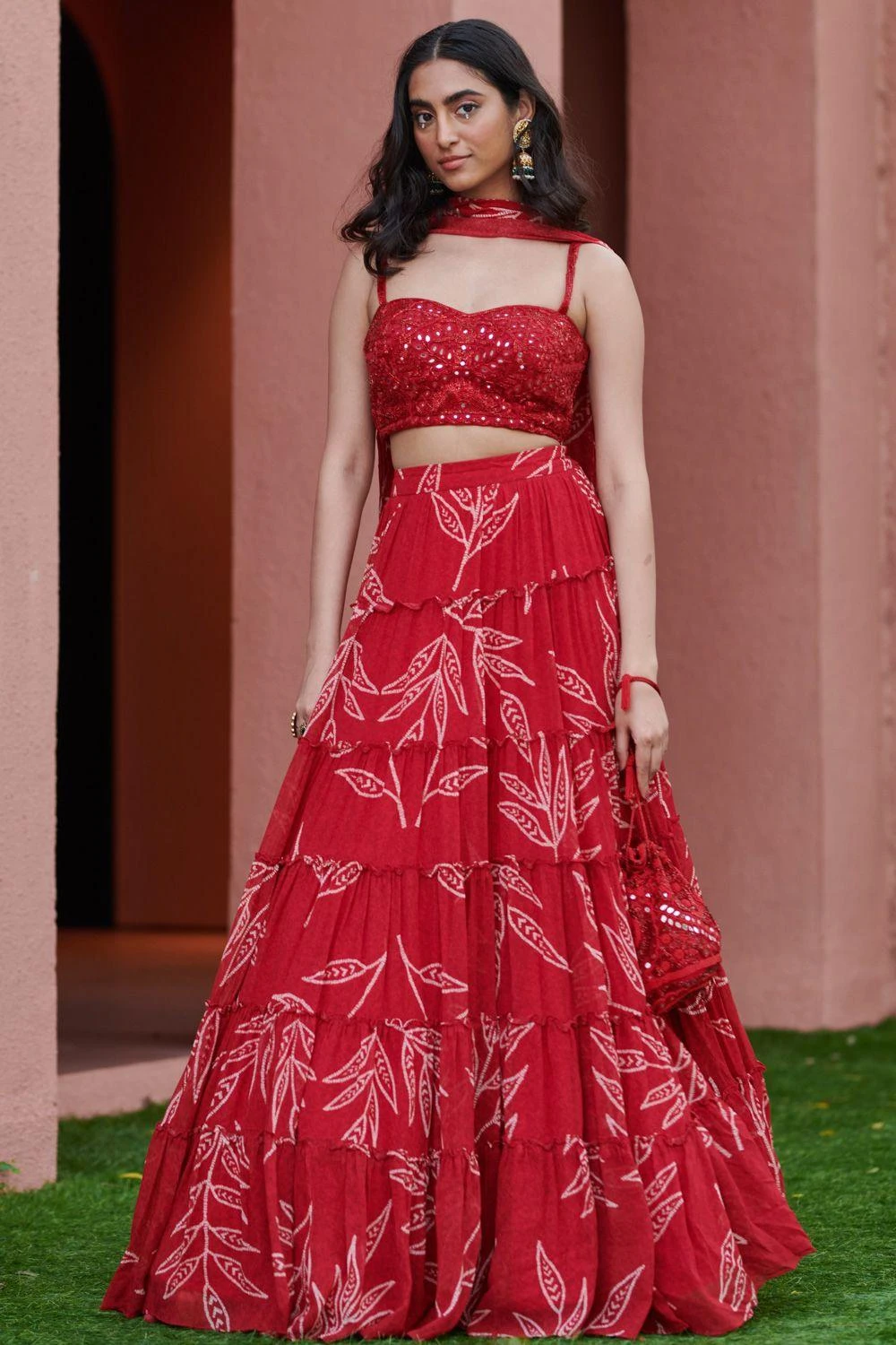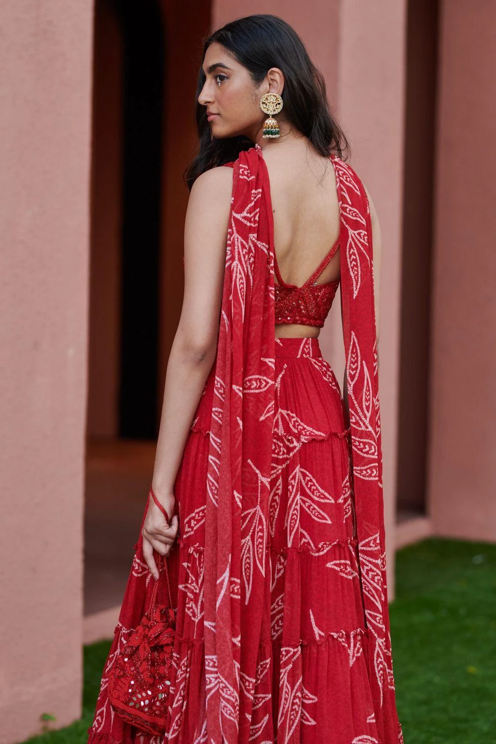 This flaming red leaf print tiered georgette skirt is paired with a matching hand embroidered blouse & a printed dupatta. Style this playful piece for daytime wedding festivities with statement earrings or a choker to complete your look.