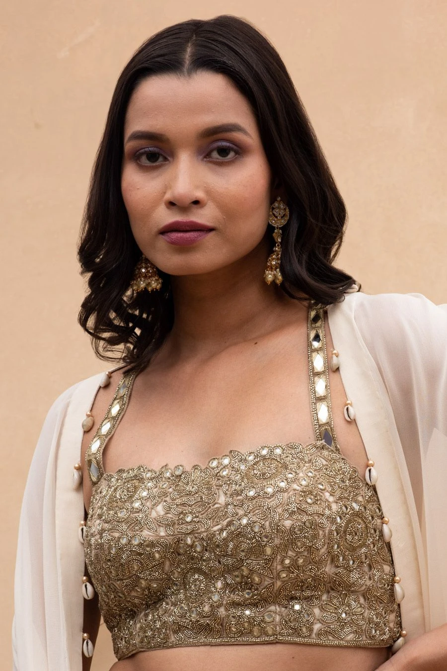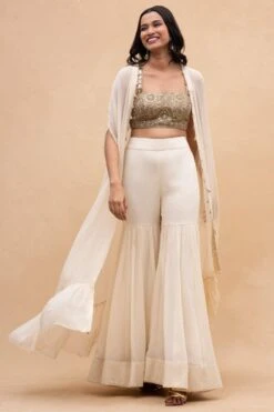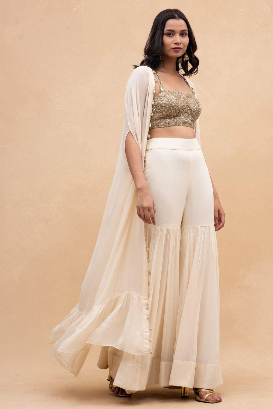 Make an exceptionally stylish wedding guest at your next destination wedding in this ivory cape set. Crafted in organza & silk, this set features a gharara paired with a hand embroidered blouse & a coordinating cape.