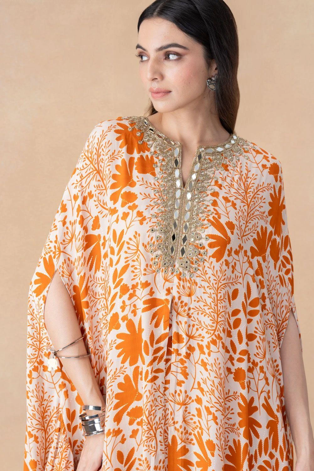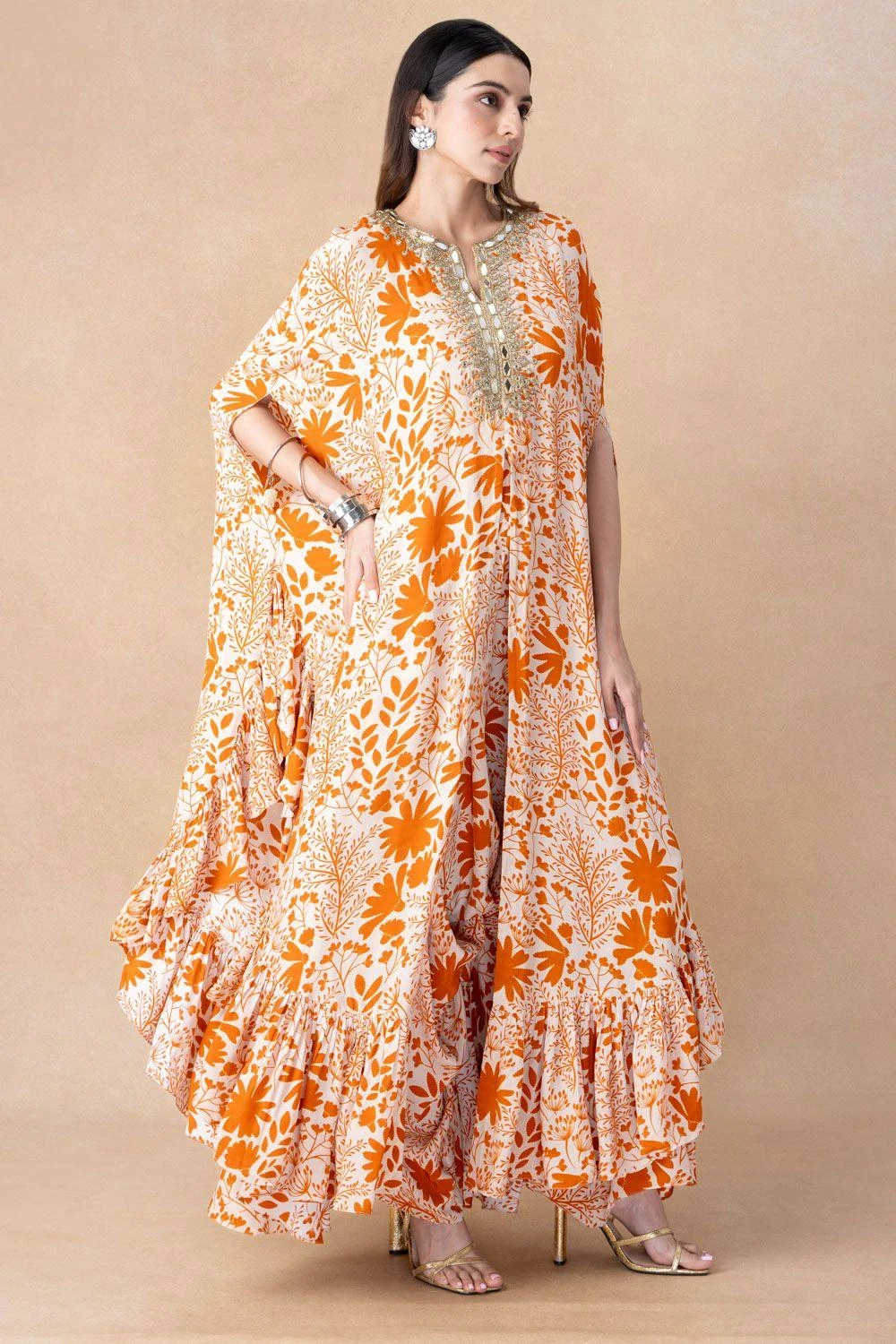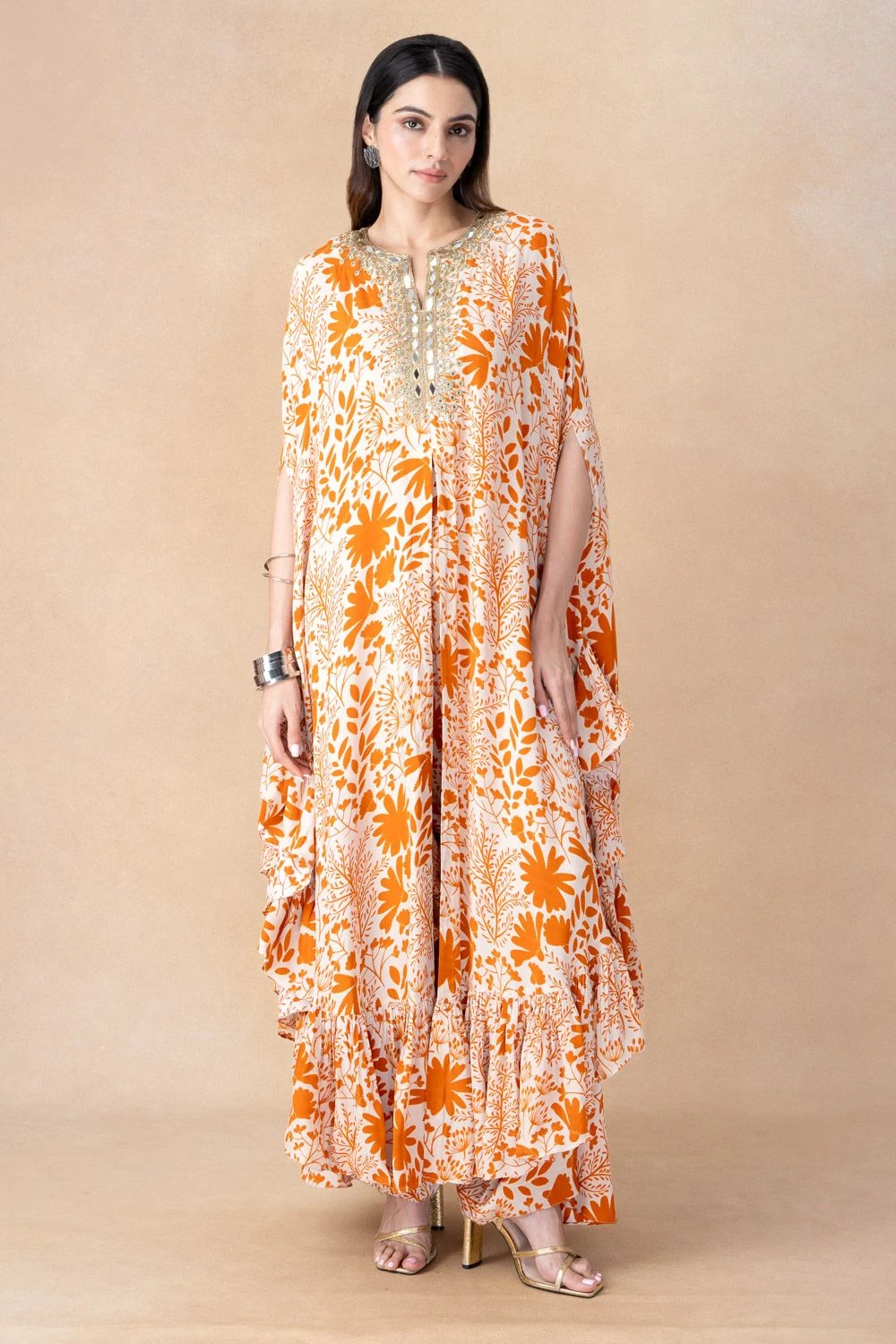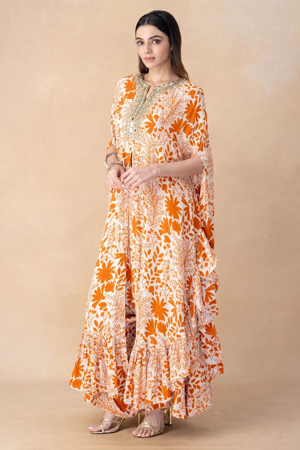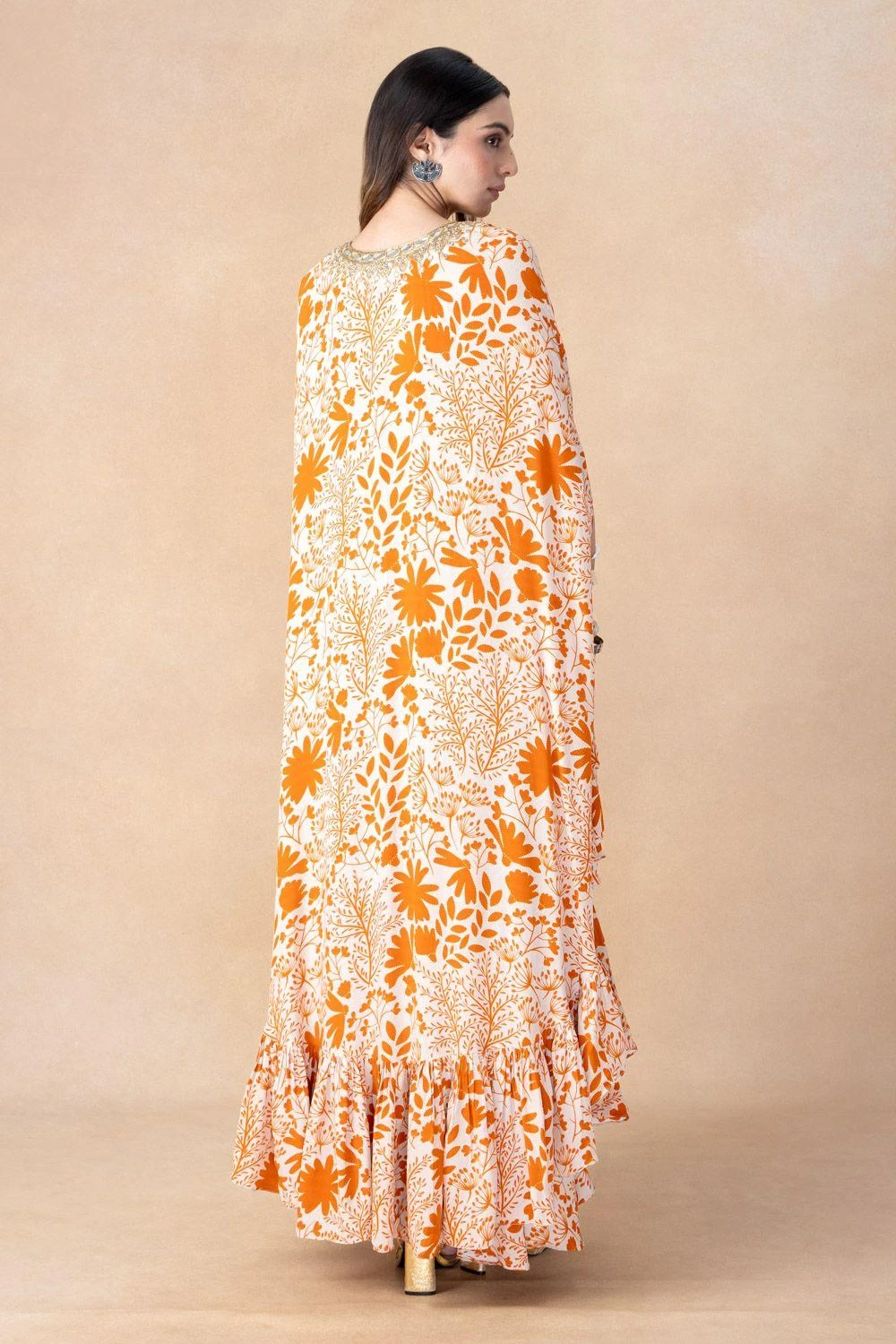 Step into opulent elegance with this hand-embroidered cape set. This ensemble is a testament to the perfect fusion of intricate craftsmanship and modern sophistication, setting the stage for a remarkable look.