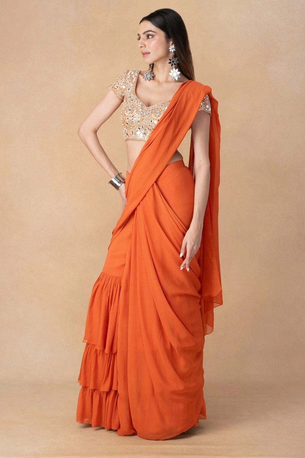 Step into opulent elegance with this hand-embroidered sari set. This ensemble is a testament to the perfect fusion of intricate craftsmanship and modern sophistication, setting the stage for a remarkable look.