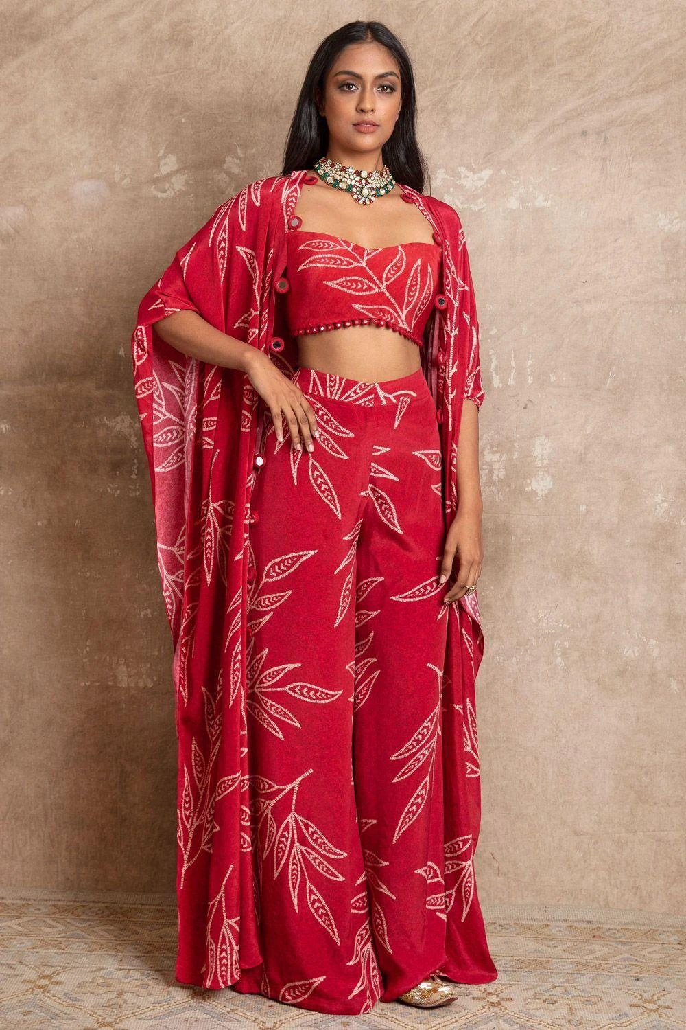 Make an exceptionally stylish wedding guest at your next destination wedding in this leaf printed cape set. It features a natural crepe bustier, paired with matching pants and a cape with mirror & cowrie shell detailing.