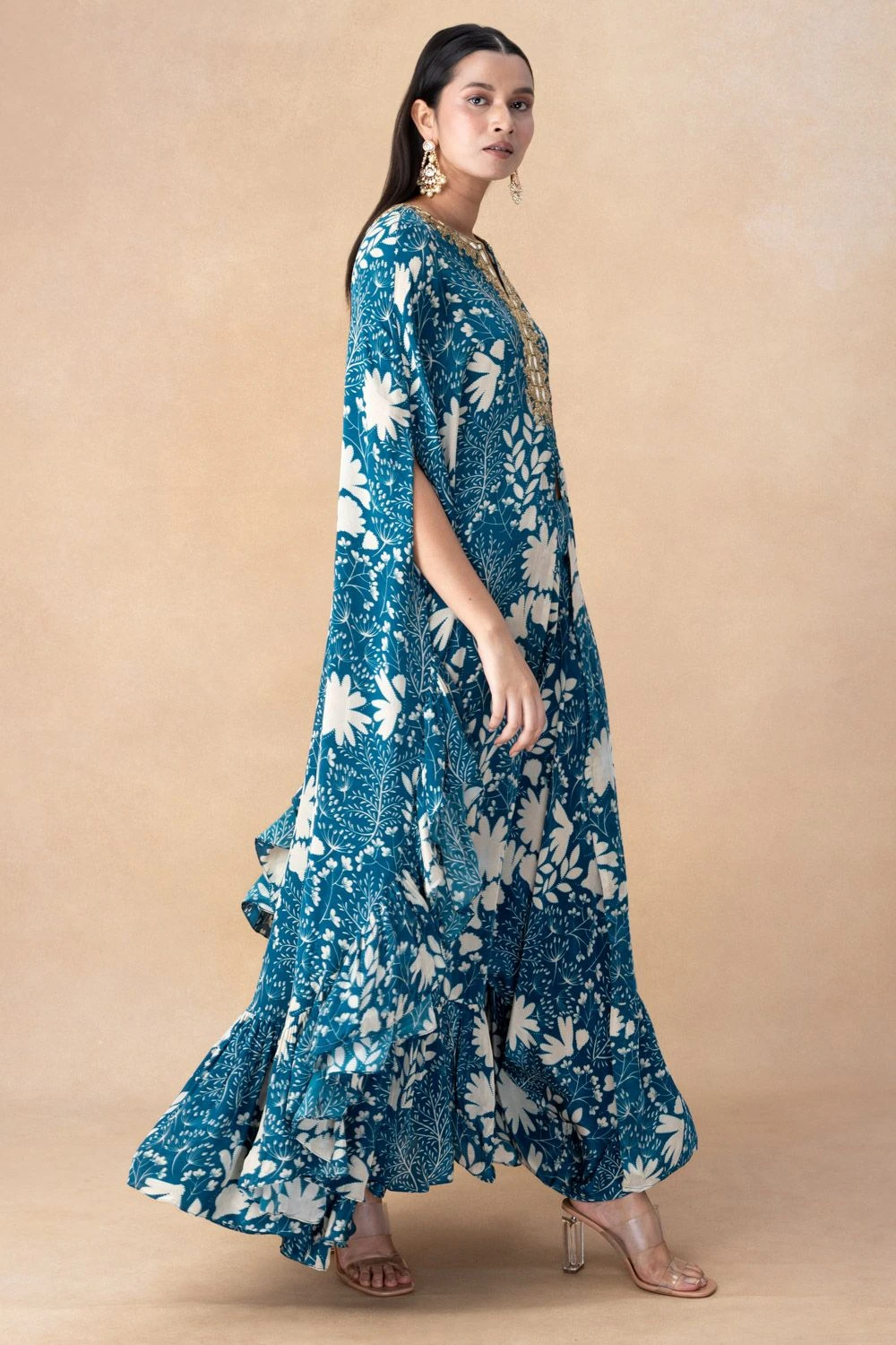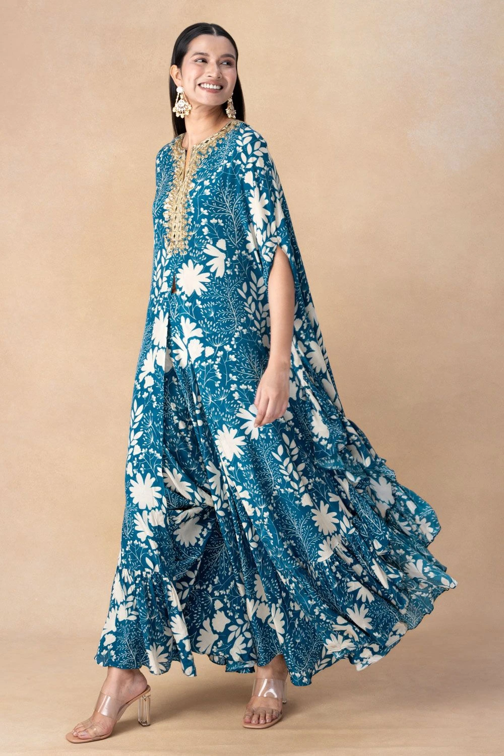 Step into opulent elegance with this hand-embroidered cape set. This ensemble is a testament to the perfect fusion of intricate craftsmanship and modern sophistication, setting the stage for a remarkable look.