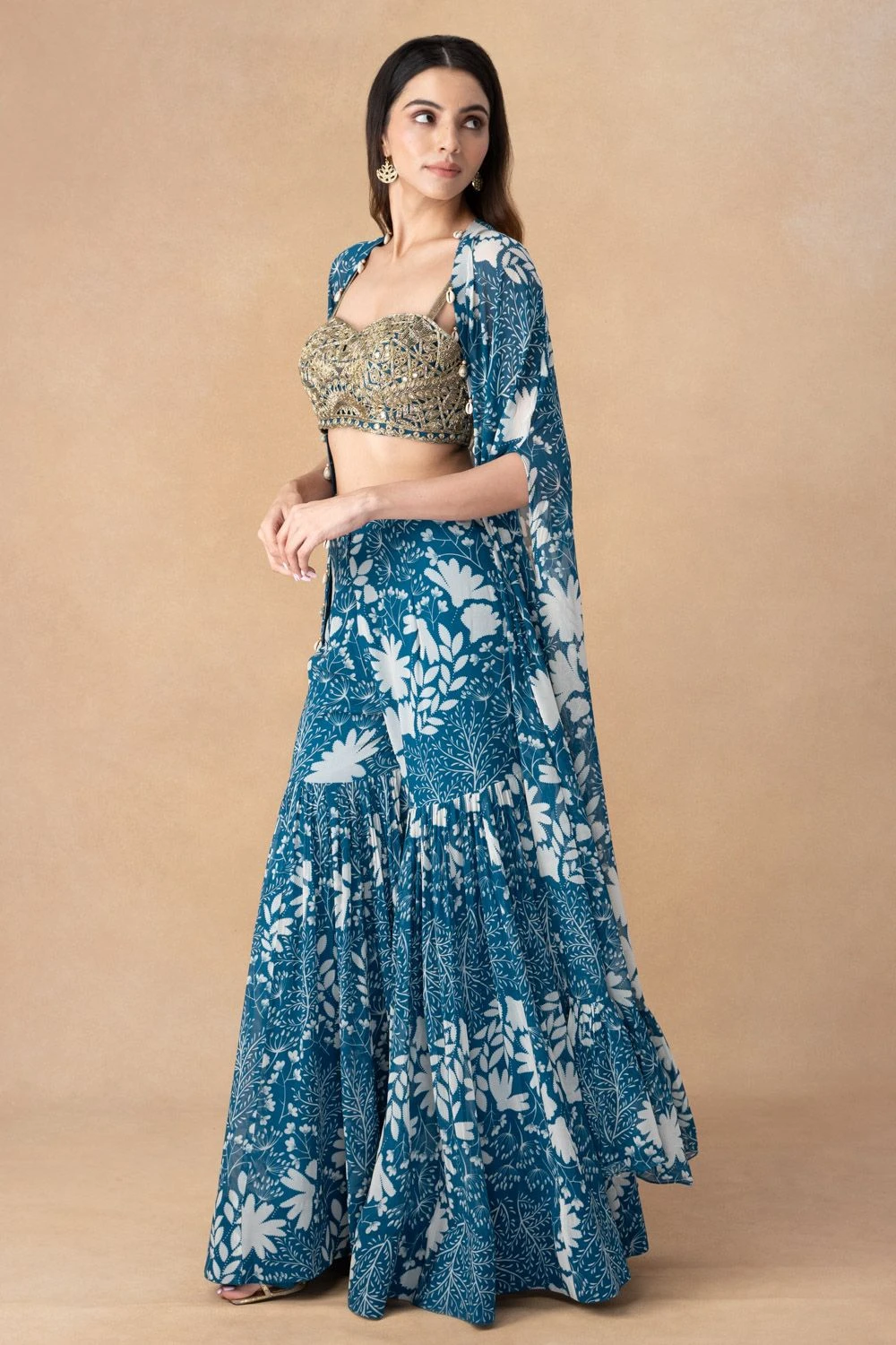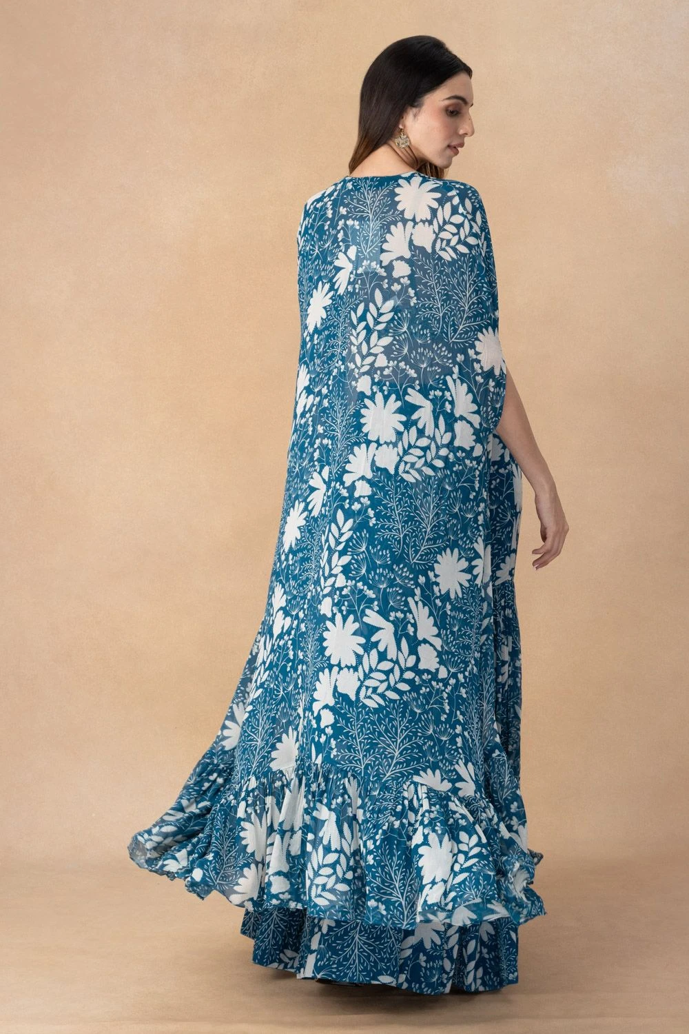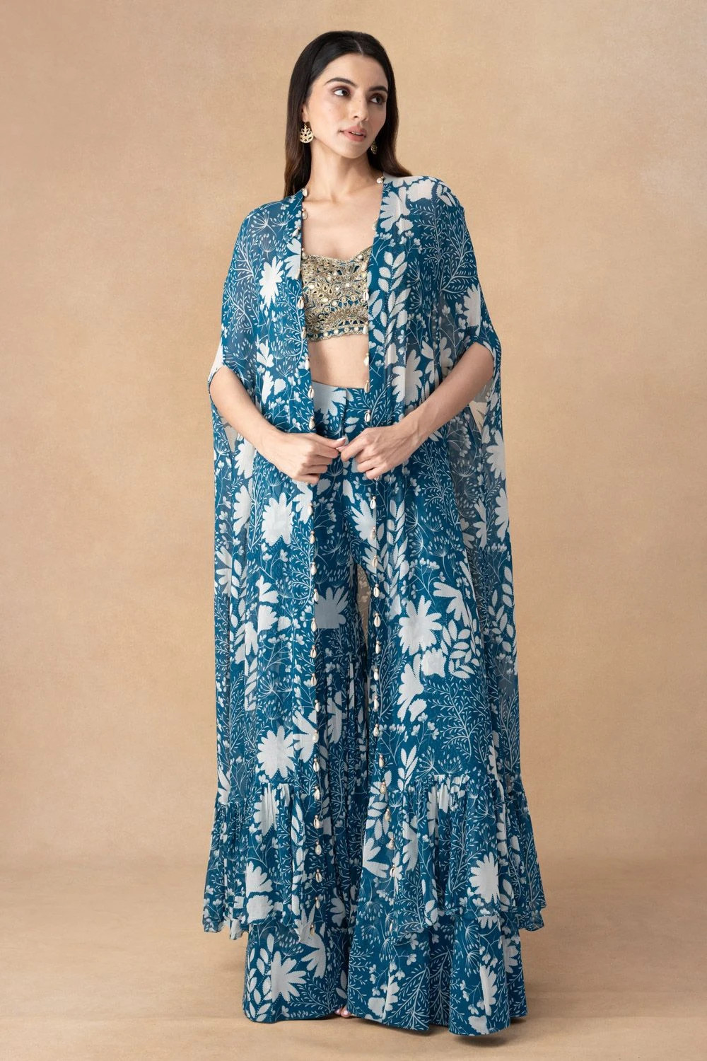 Step into opulent elegance with this hand-embroidered cape set. This ensemble is a testament to the perfect fusion of intricate craftsmanship and modern sophistication, setting the stage for a remarkable look.