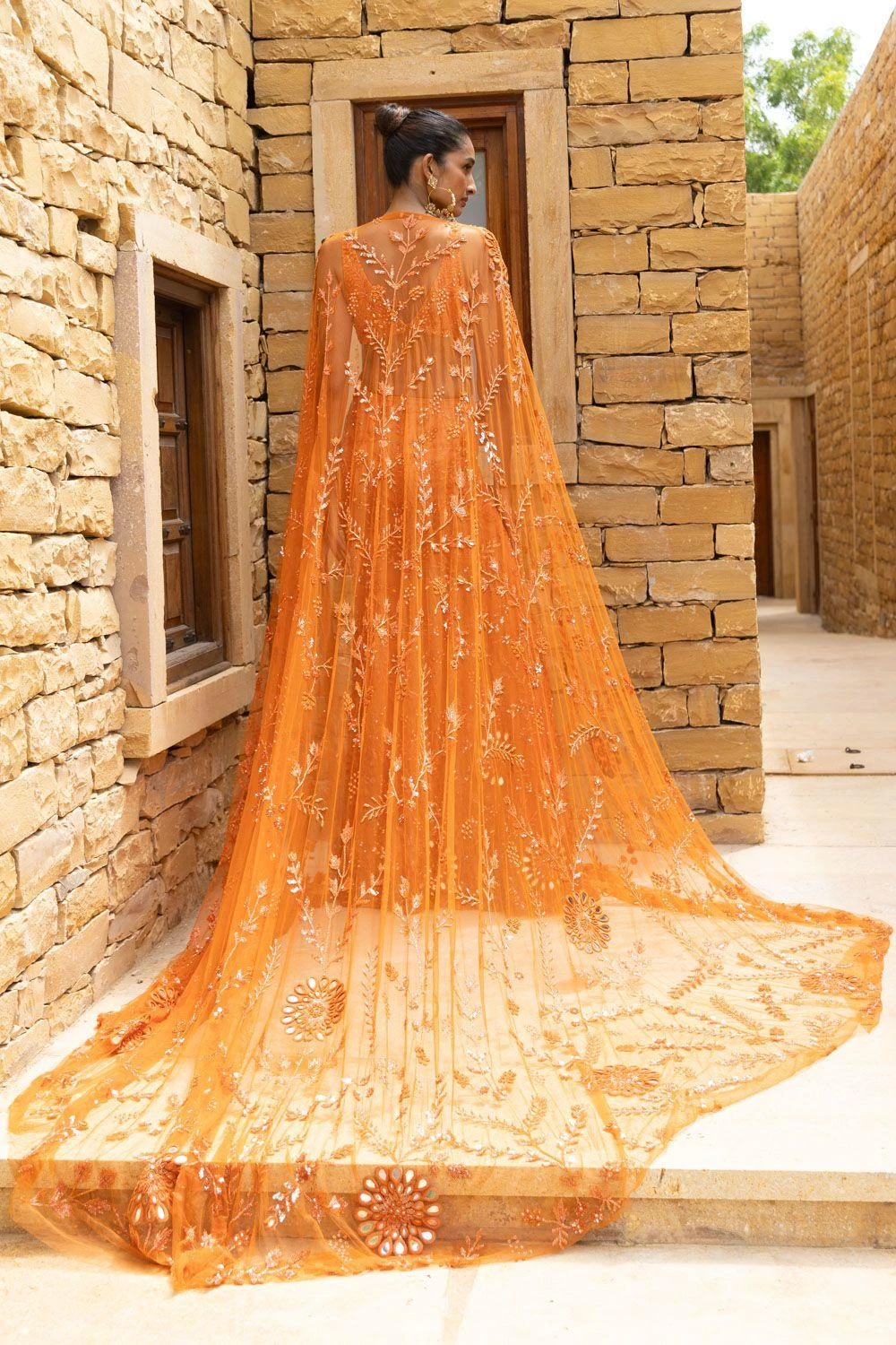 Indulge in opulent elegance with this Toasted Orange sequin, cutdana, and mirror hand-embroidered skirt, blouse, and cape ensemble. Add a pair of statement earrings to complete the look.