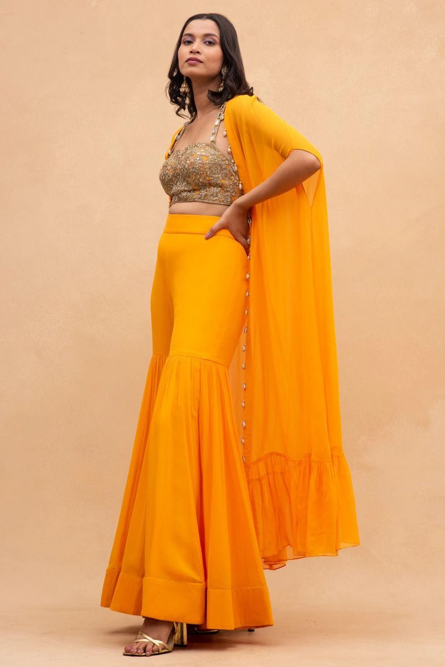 Make an exceptionally stylish wedding guest at your next destination wedding in this yellow cape set. Crafted in organza & silk, this set features a gharara paired with a hand embroidered blouse & a coordinating cape.