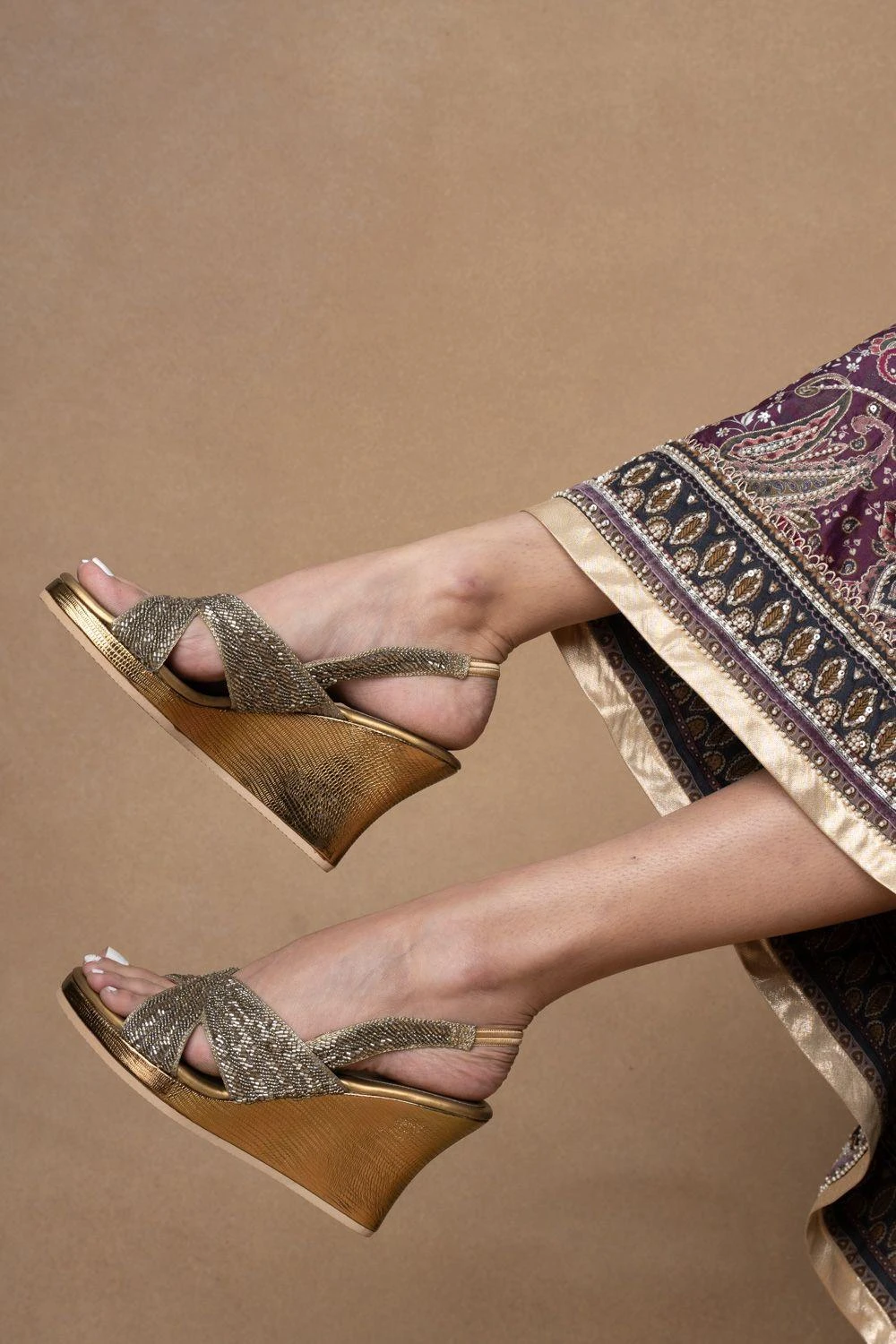 Step into luxury with these exquisitely embellished wedges. Each step radiates opulence, adorned with intricate details that captivate onlookers. Elevate your style with these glamorous statement shoes.