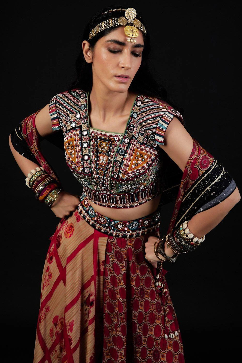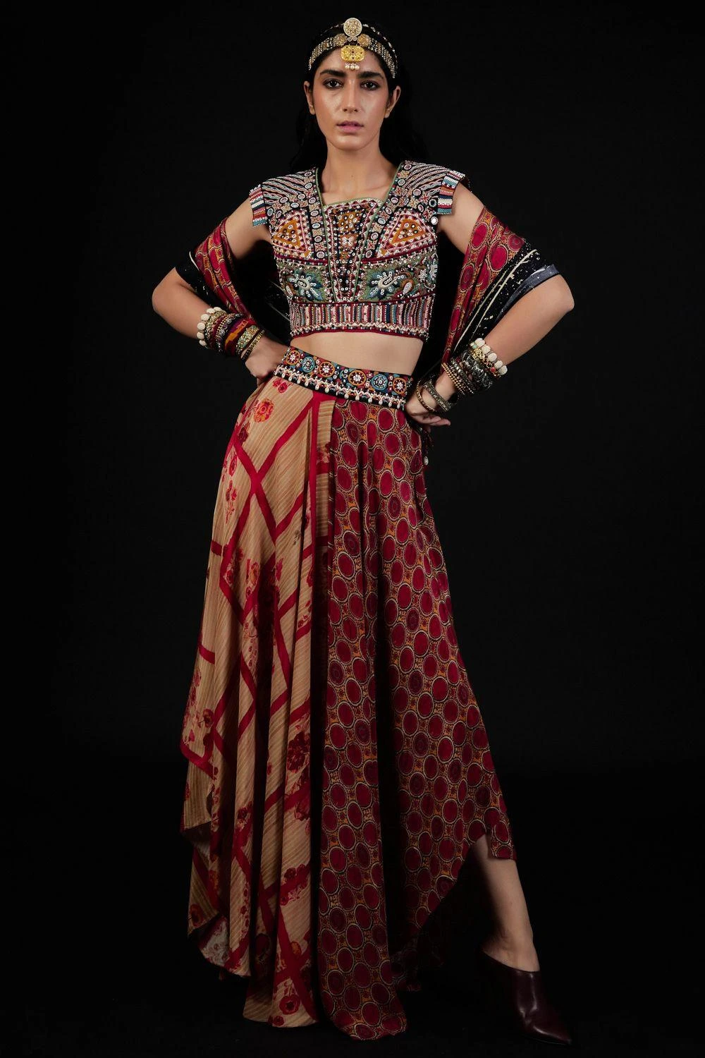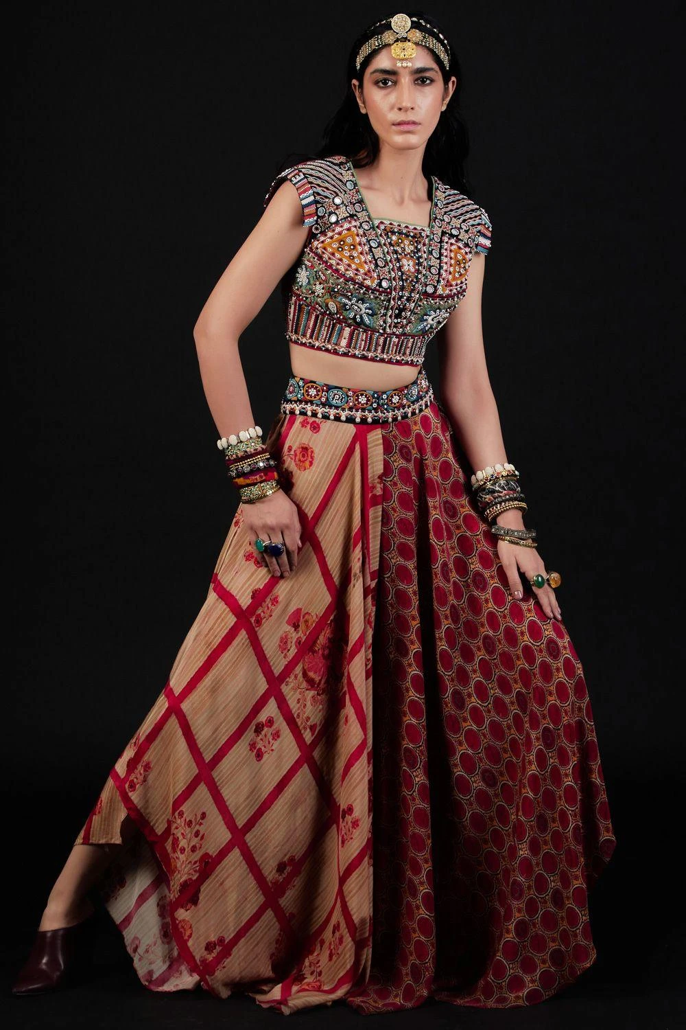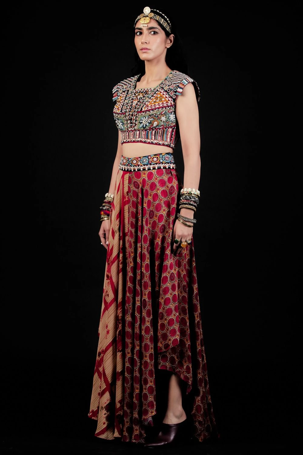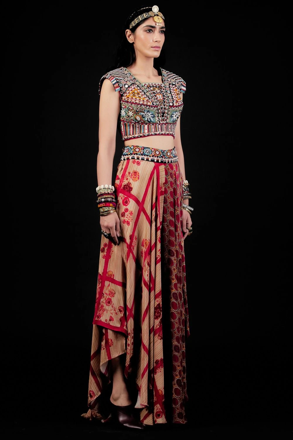 Make a boho flair at your festivities in this flirty & feminine co-ordinate set. It features a raw silk statement cropped top embellished with mirror work & embroidery, paired with an asymmetric printed flowy pants.