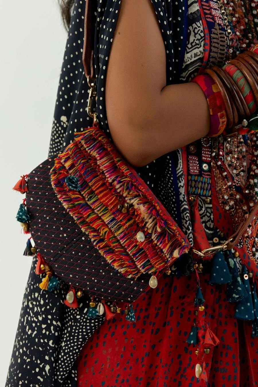Add a fun contemporary twist to your festive look with this quirky arm candy. This quilted sling bag features tribal tassel detailing. Style it with a co-ord set from the collection to complete the look.
