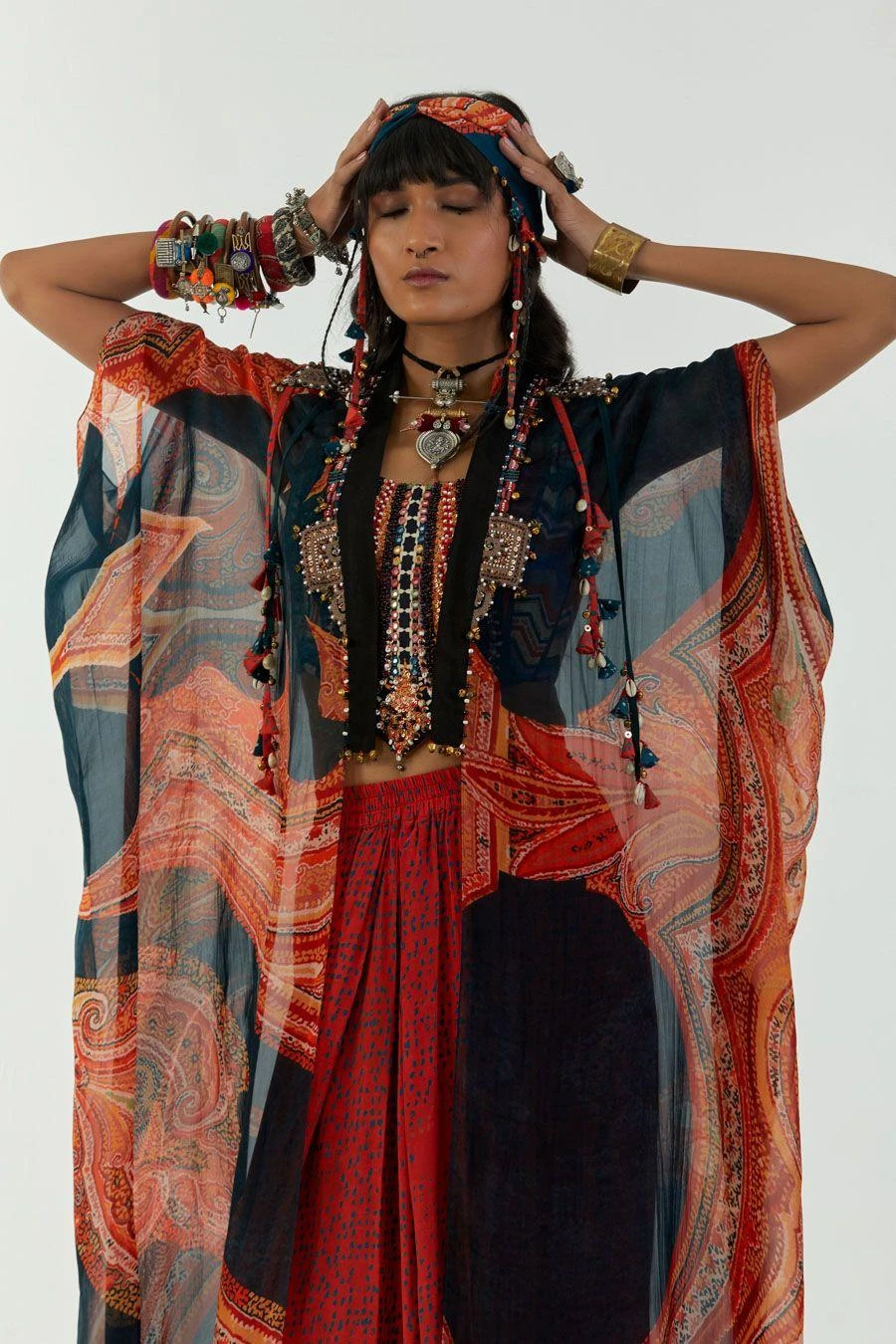 Maximise the life of your wardrobe with this exquisite jacket set. Crafted in silk, this set features a kaftan dupatta embroidered jacket with tribal tassel & ghungroo detailing, paired with an embroidered corset and printed draped trousers.