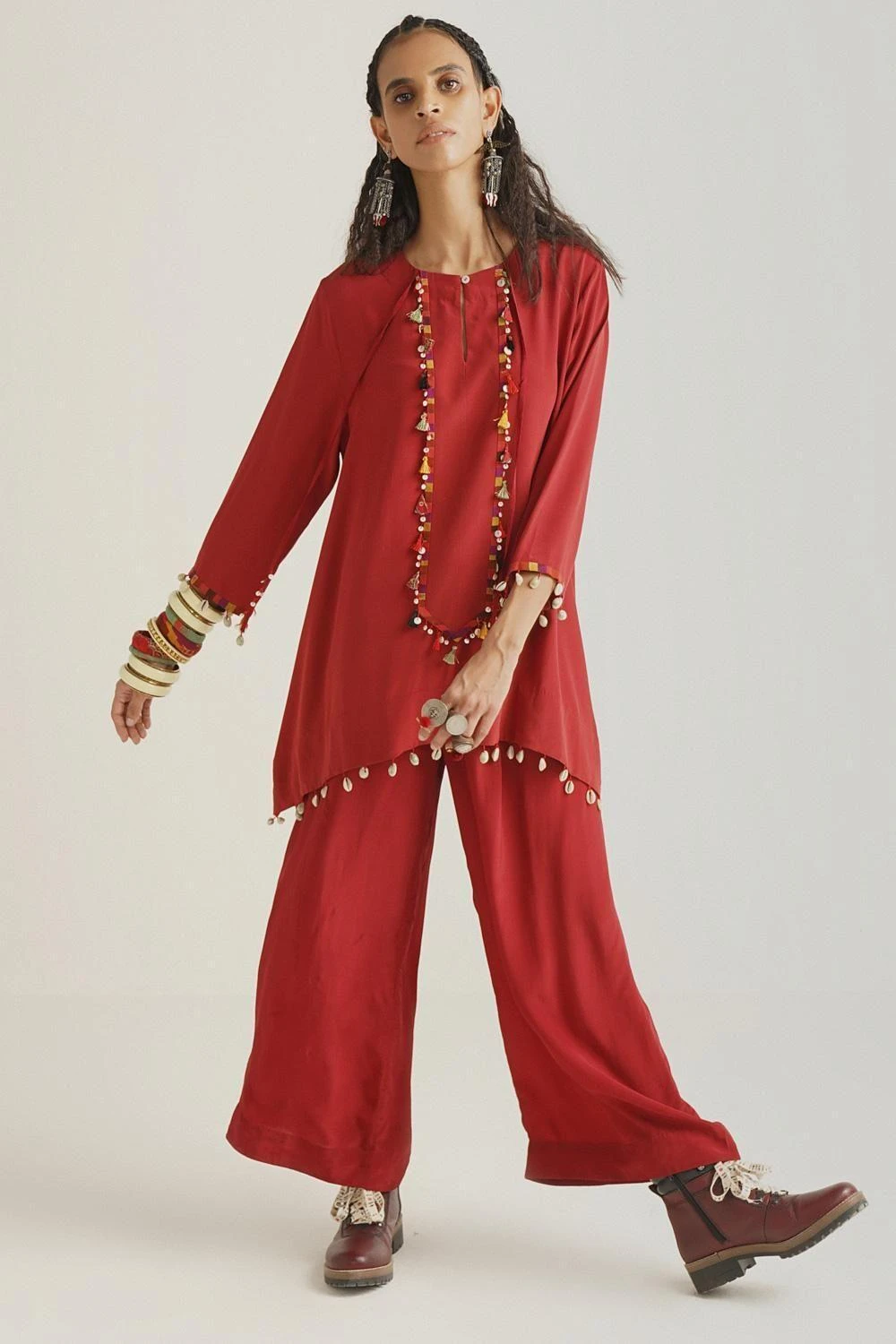 Set in a natural crepe fabric this sindoor coloured shirt tunic & palazzo set is perfect for intimate festive occasions. It is highlighted with delicate embroidery details on the neckline & hem. Style this looks with a statement clutch.