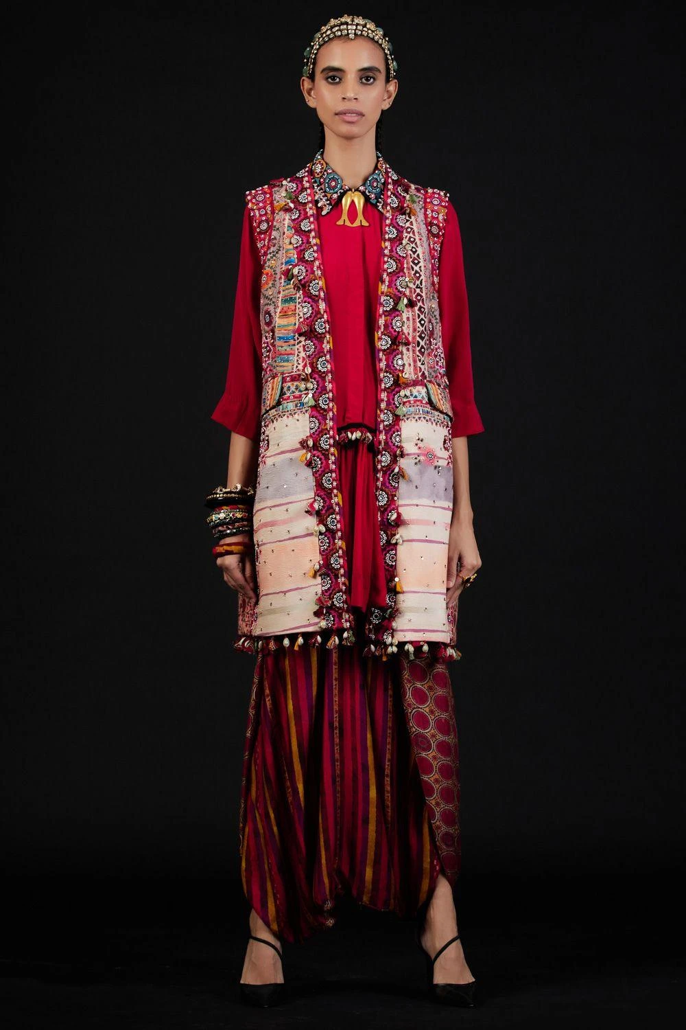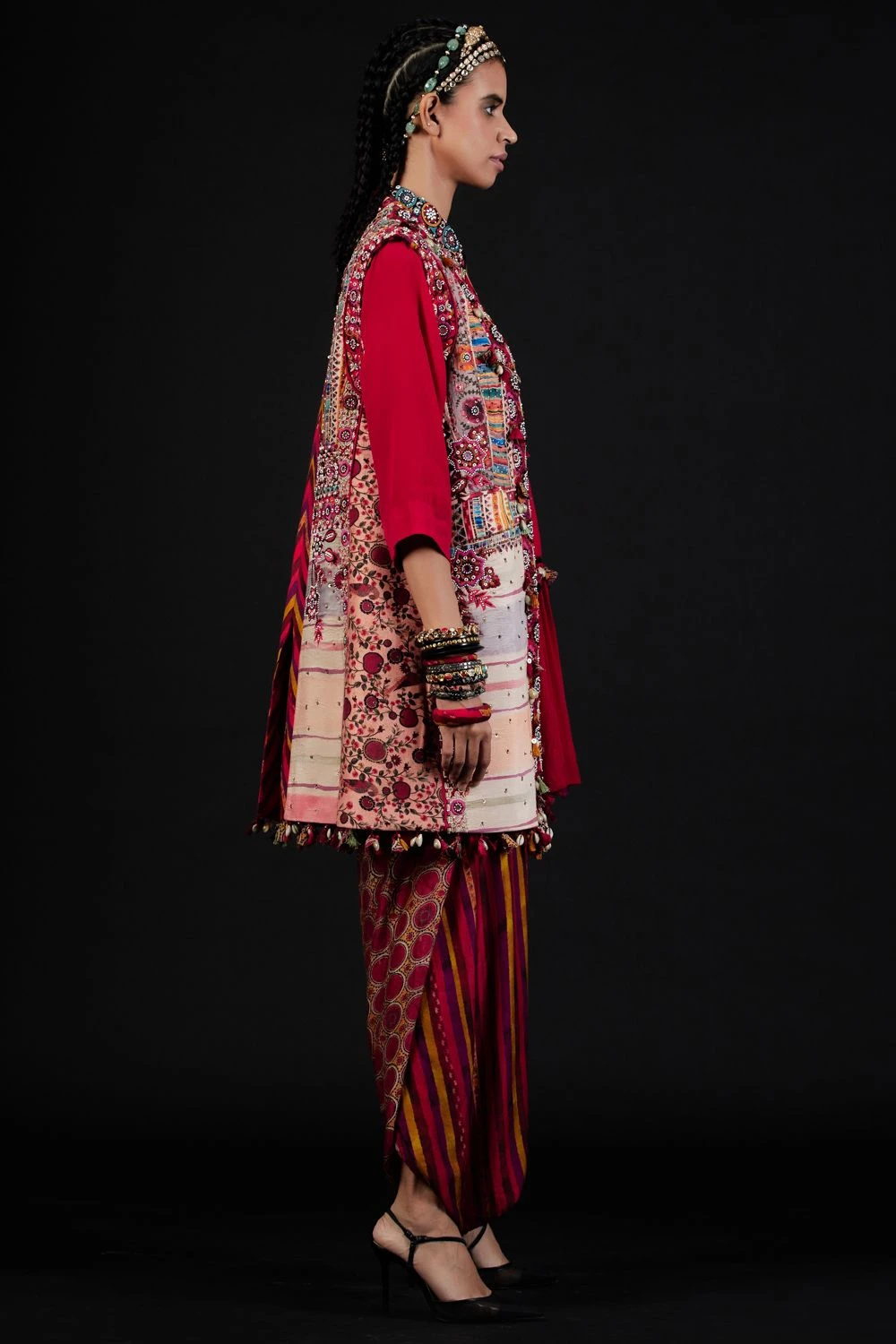 Add a bohemian flair to your festive looks with this ruhi sleeveless jacket. It is cut in a raw silk base with patchwork details and adorned with mirror work & cowry shells. You can style it over a bustier & a lehenga for a festive look.