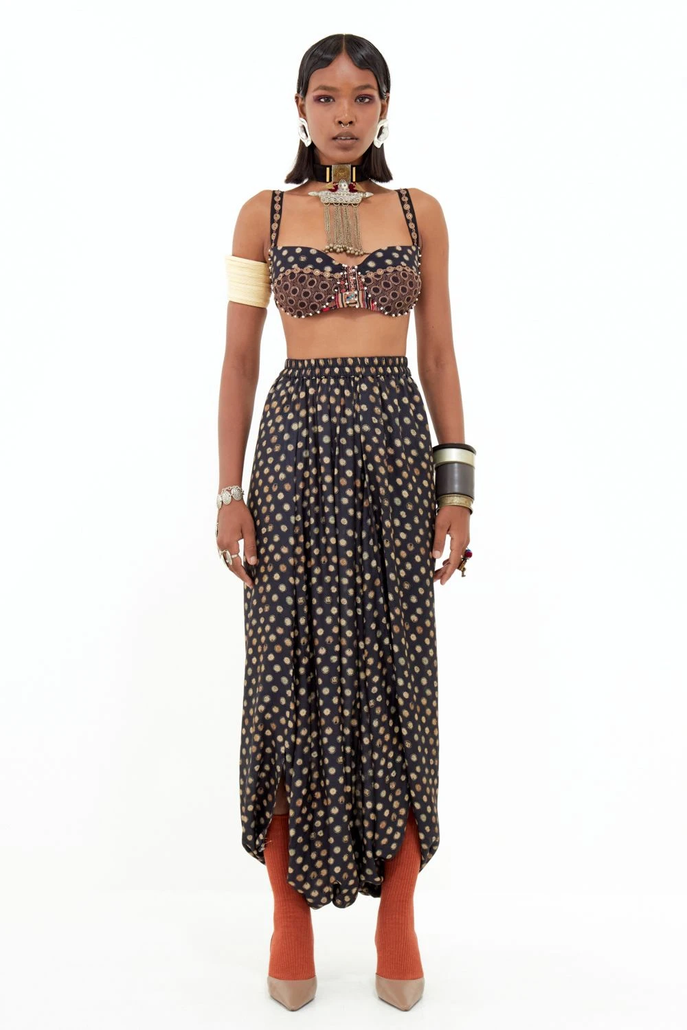 Maximise the life of your wardrobe with this exquisite corset blouse. Crafted in cotton silk, this zari and marodi embroidered corset blouse features ghungroo and tie up details at back.