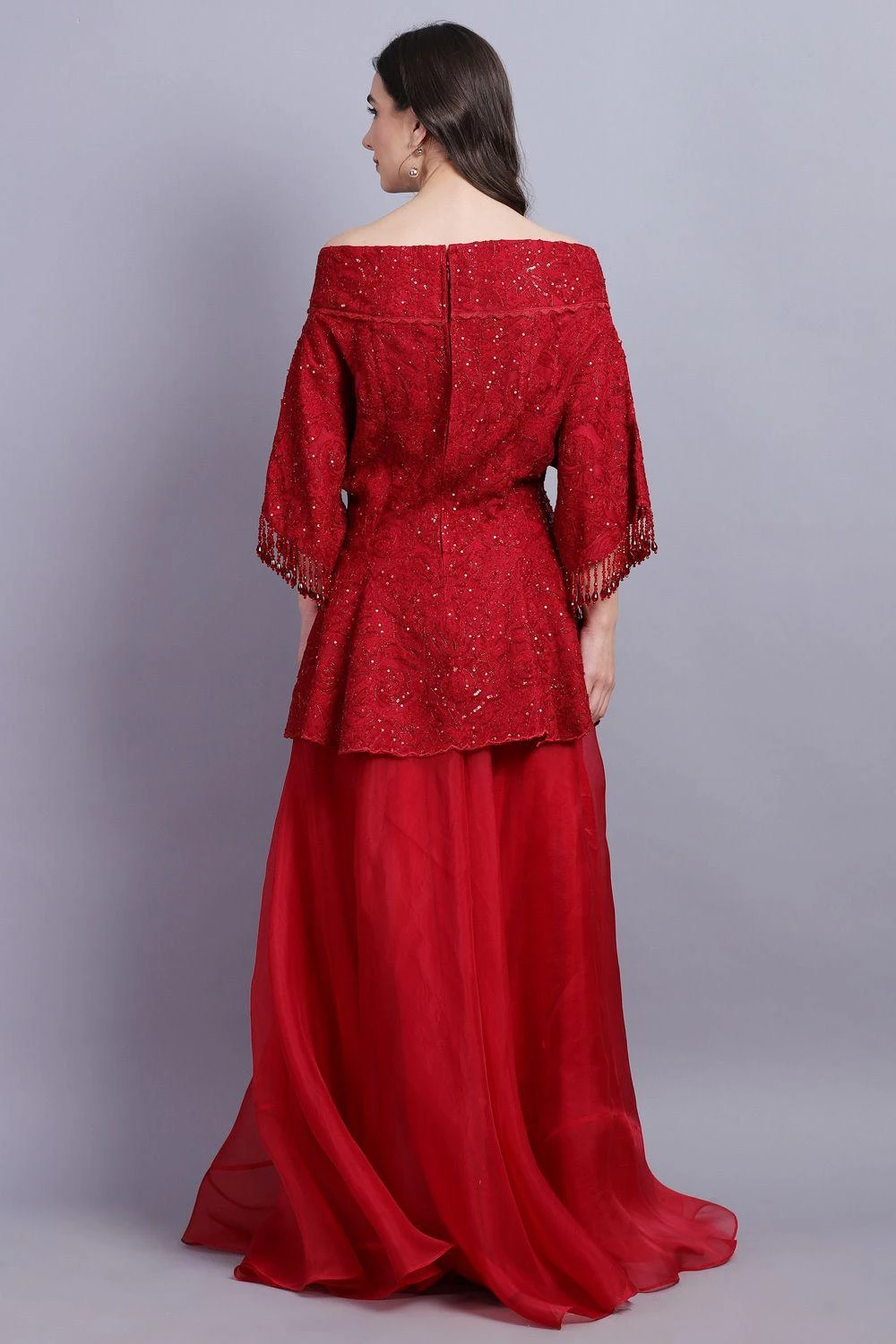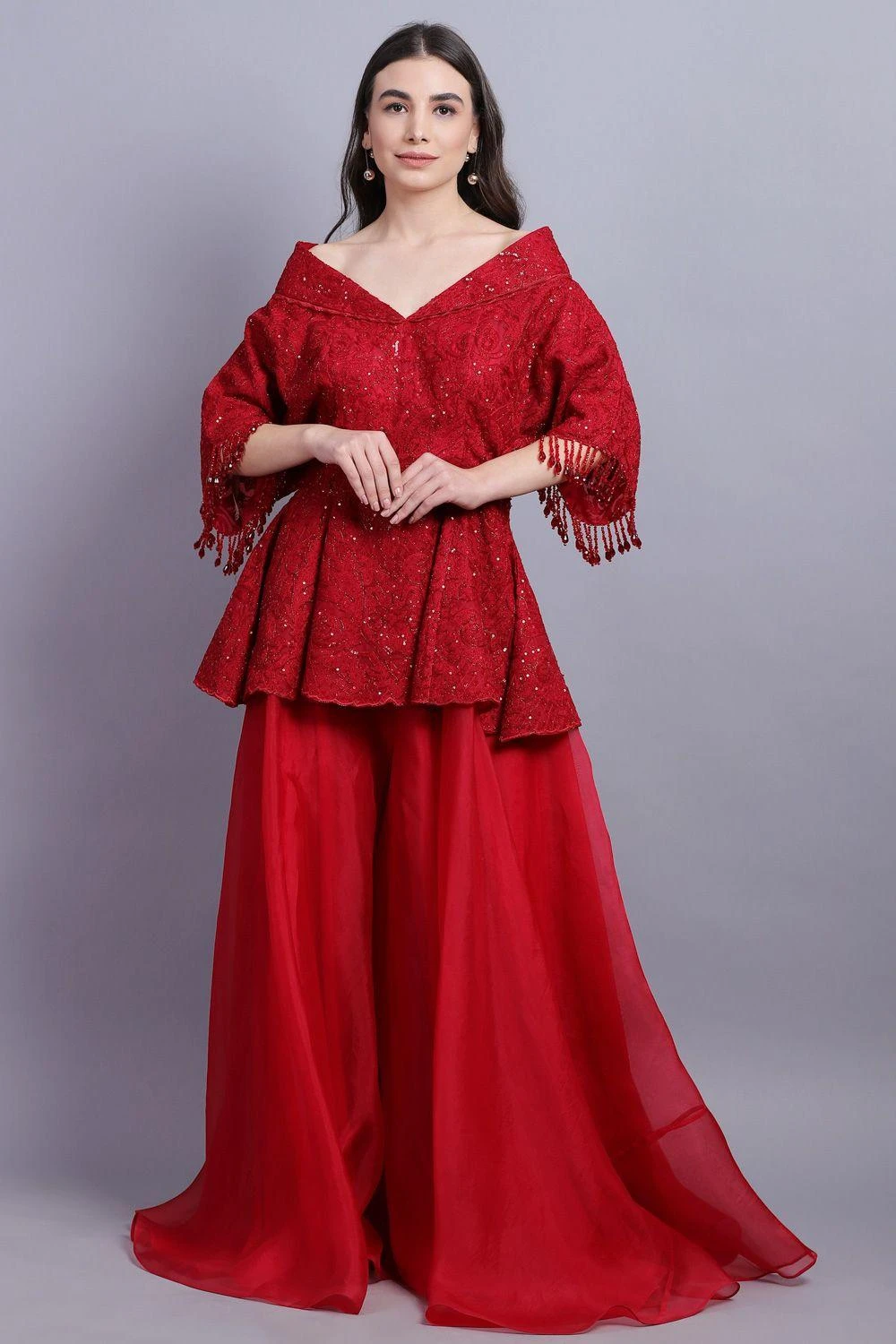 Make a bold & fierce statement in this deep red sharara set which is meant to shimmer in your unforgetful evenings. The plain organza sharara pants are paired with a statement slip shoulder net jacket with all over embroidery & tassels.