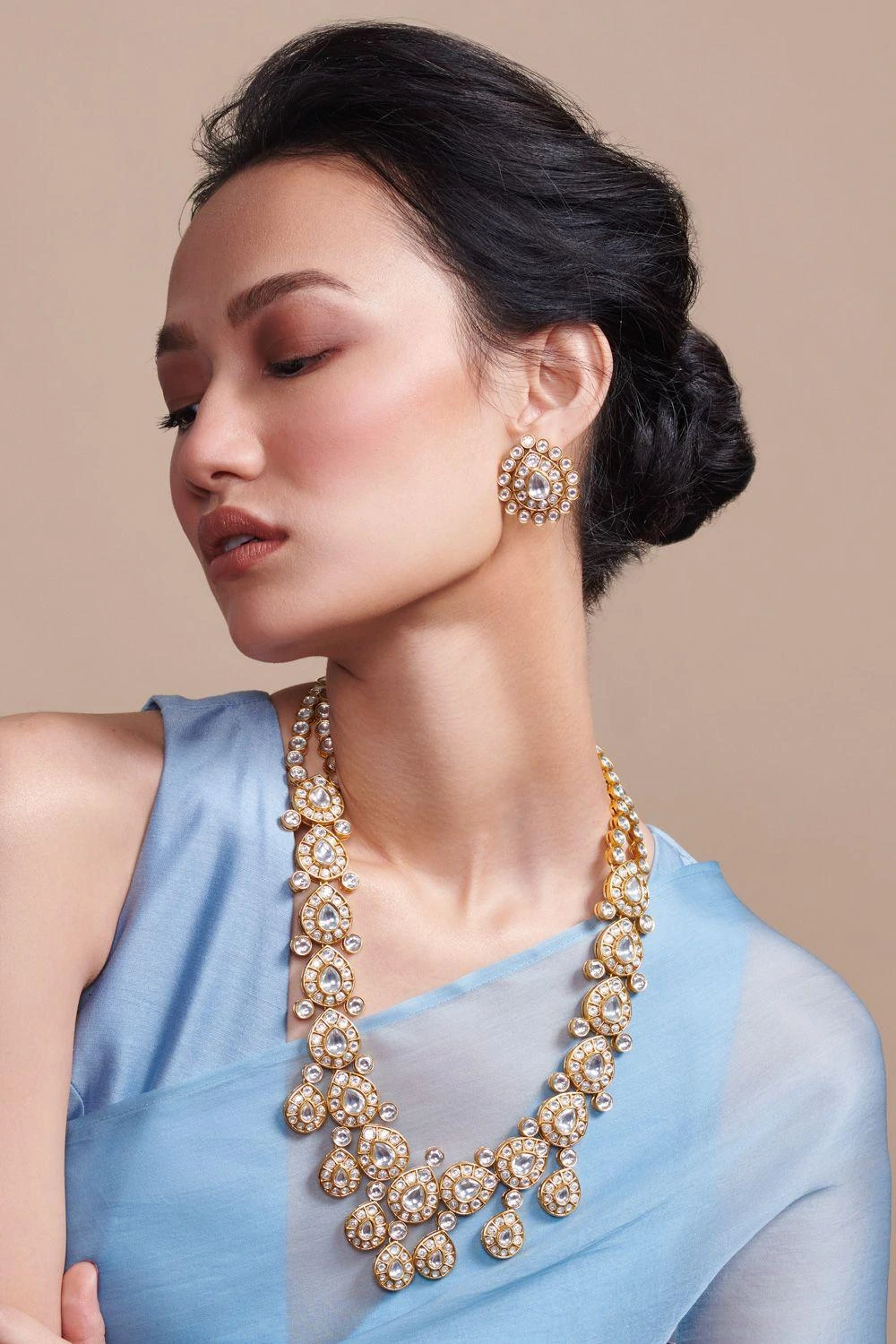 This ethereal jewel is crafted out of round and pear-shaped Kundan that resemble drops of moonlight. Pair it with the Astor studs to complete your look.