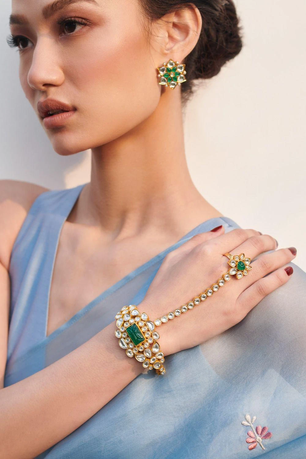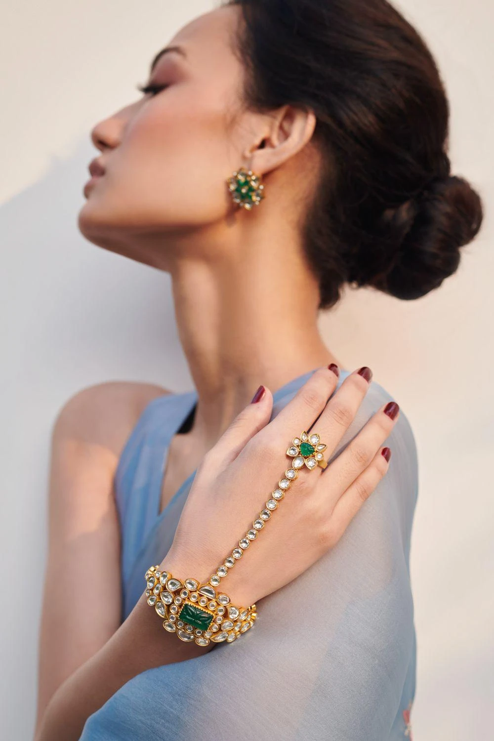 Indulge in the allure of these playful and radiant stud earrings. Crafted with deep green stones totalling 2.5 carats, complemented by sparkling white stones, they effortlessly elevate any day or evening ensemble.