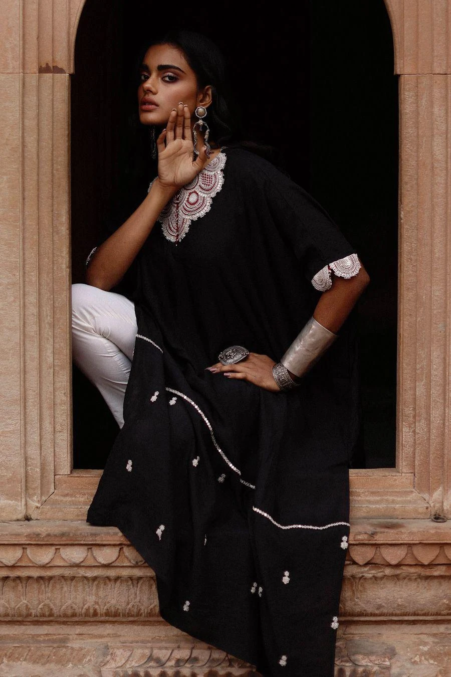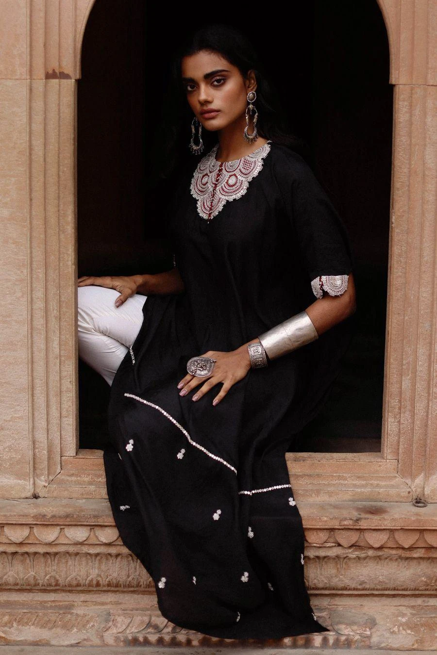 The perfect amalgamation of style & comfort, this kaftan set works across occasions. Crafted in pure mulberry silk, this set features a kaftan with embroidered marodi work on the yoke, cuff and bottom panel paired with off white cotton lycra pants.