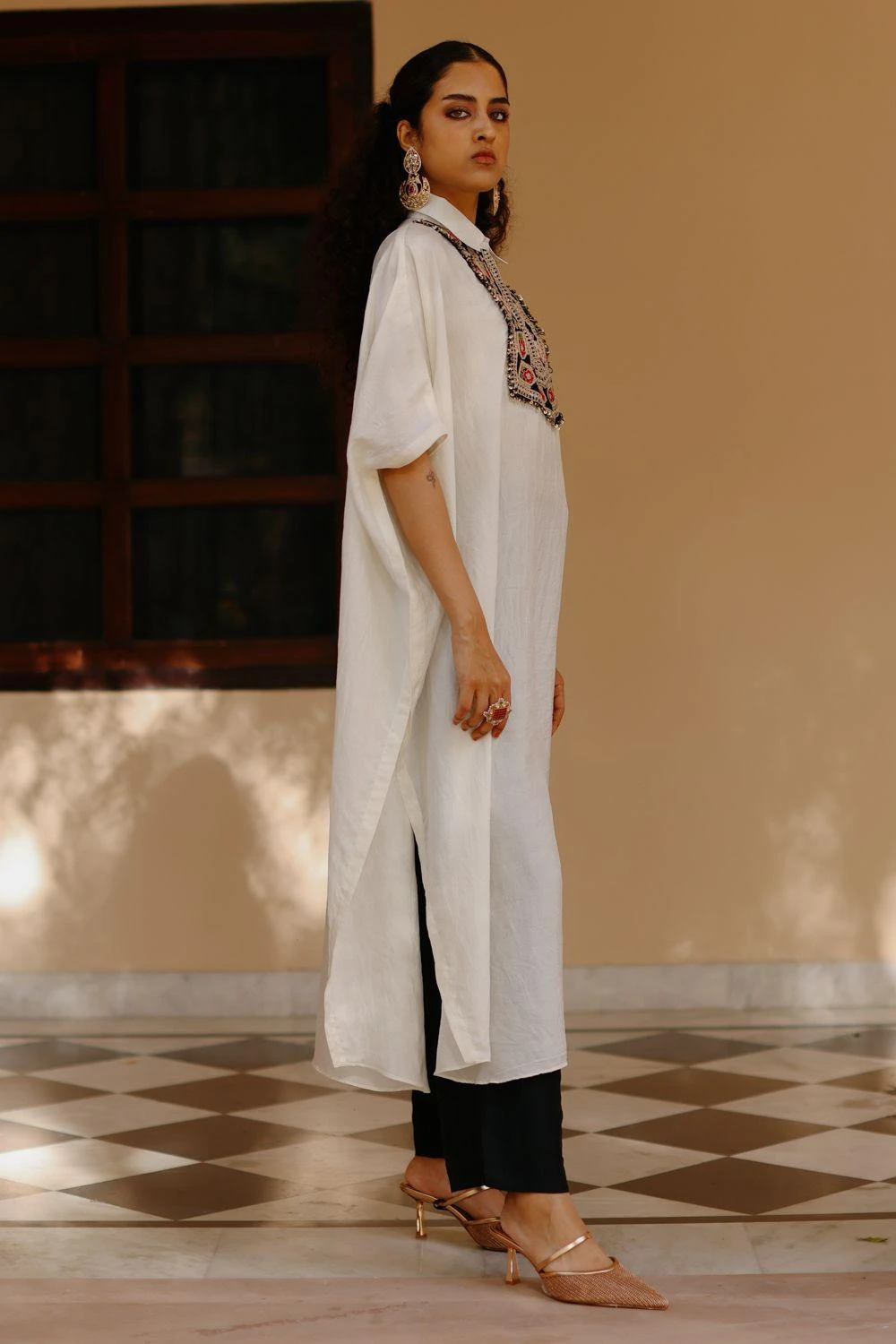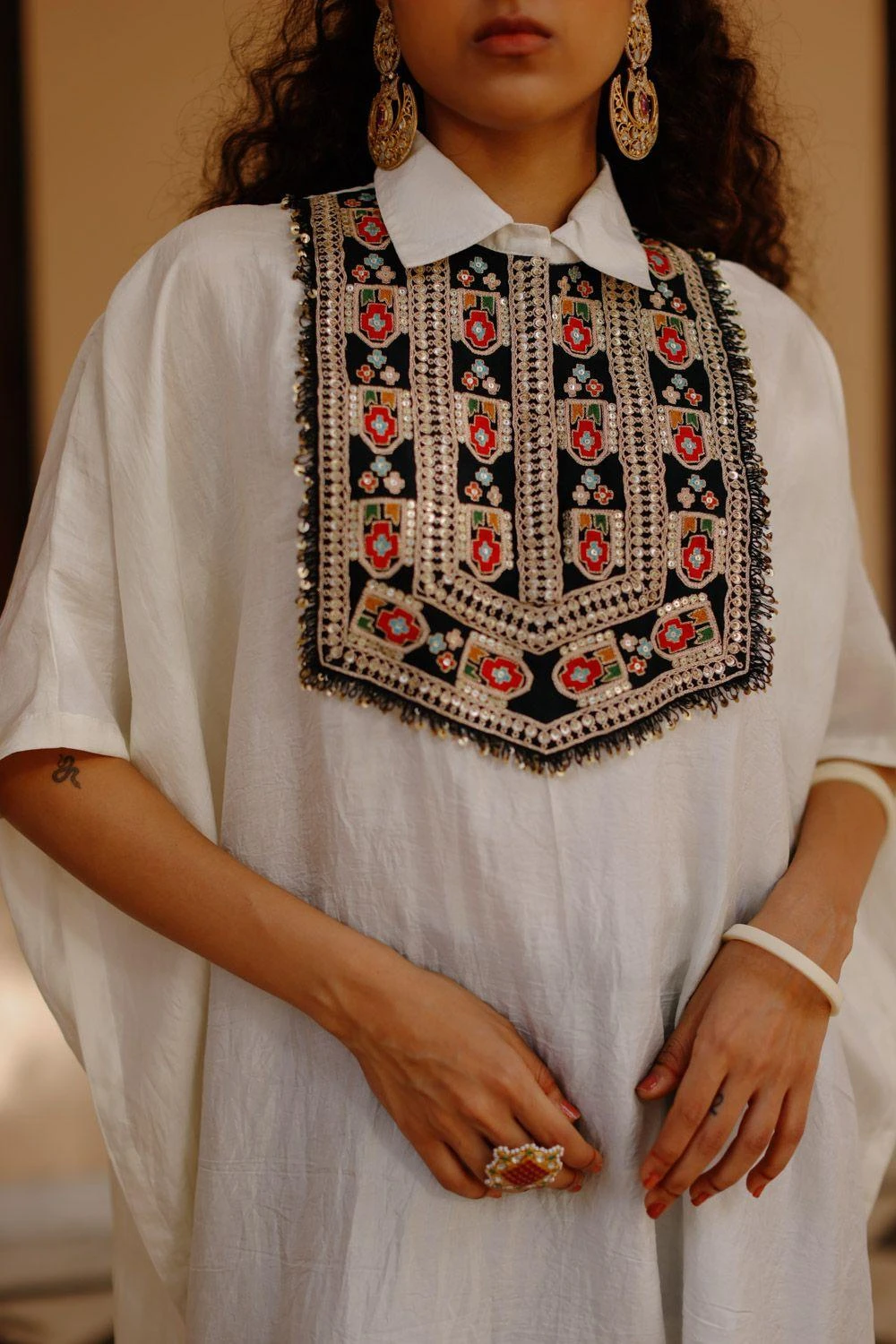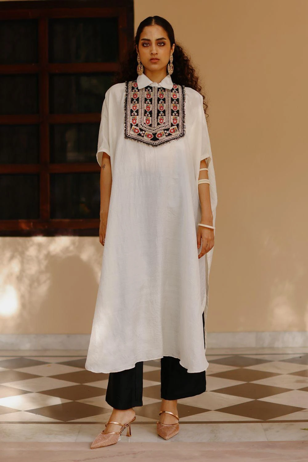 Indulge in luxury with this pure mulberry silk kaftan, adorned with intricate marodi and resham embroidery on the yoke. Paired elegantly with slim black cotton lycra pants, it’s a timeless statement of grace and style.