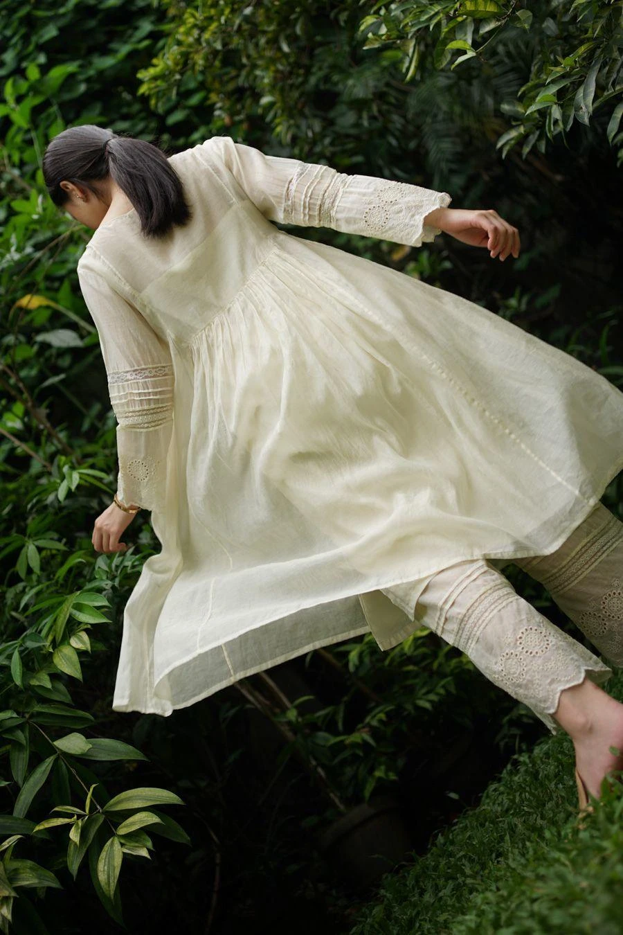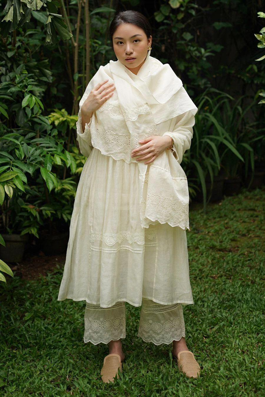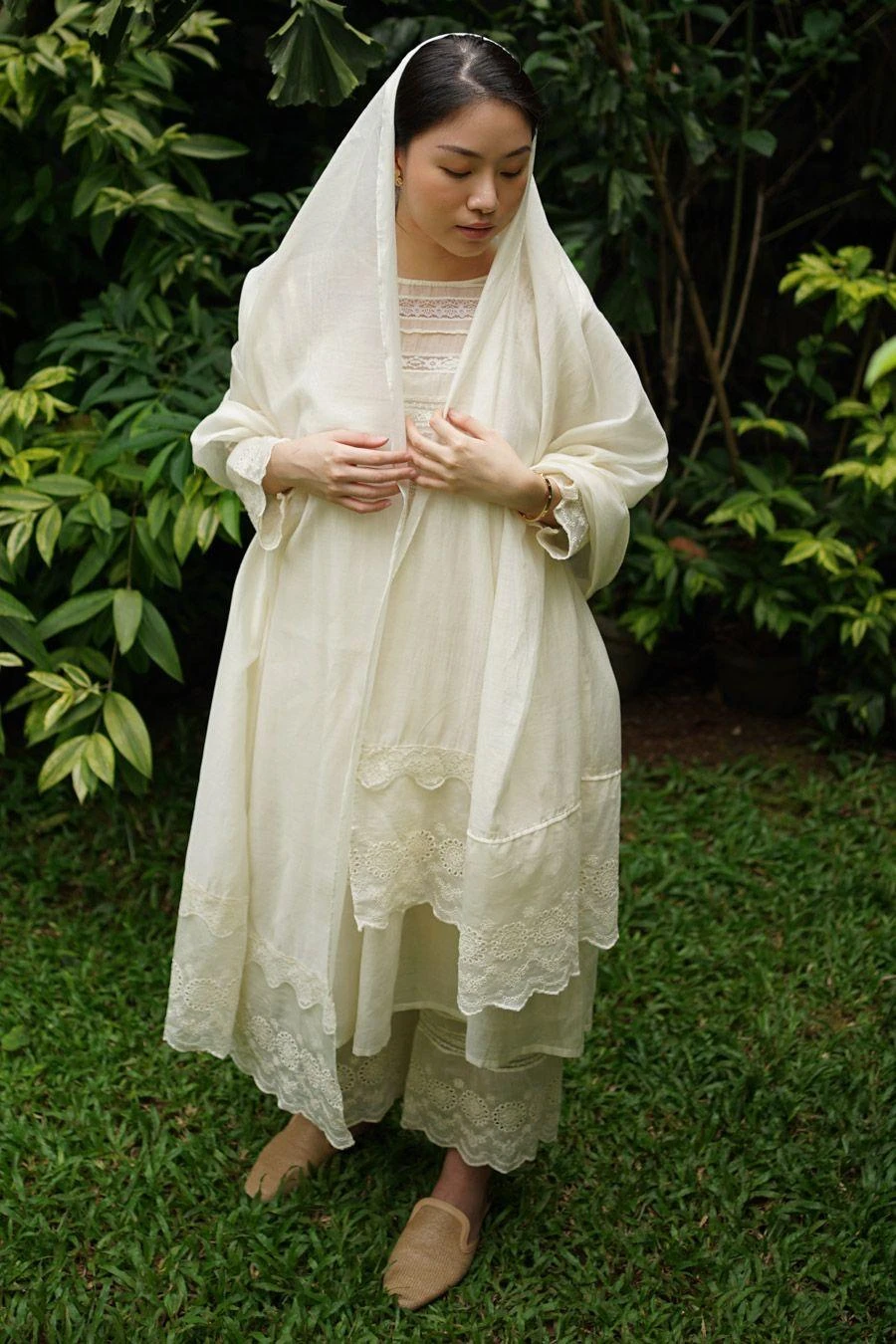 Take your layering game a notch higher with this ivory dupatta. Crafted in chanderi cotton silk, this dupatta features delicate lace detailing with a tonal embroidery panel on the edges.