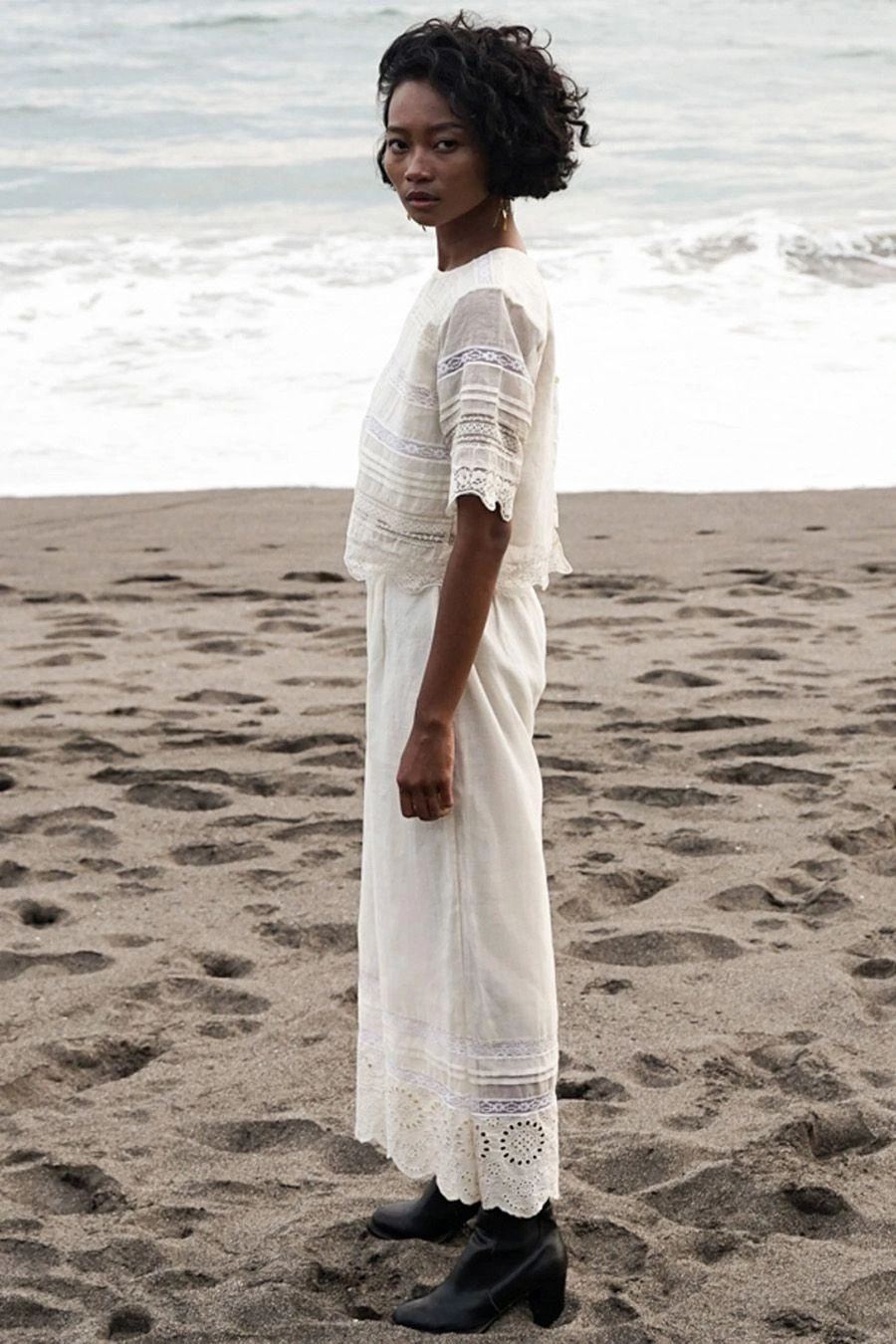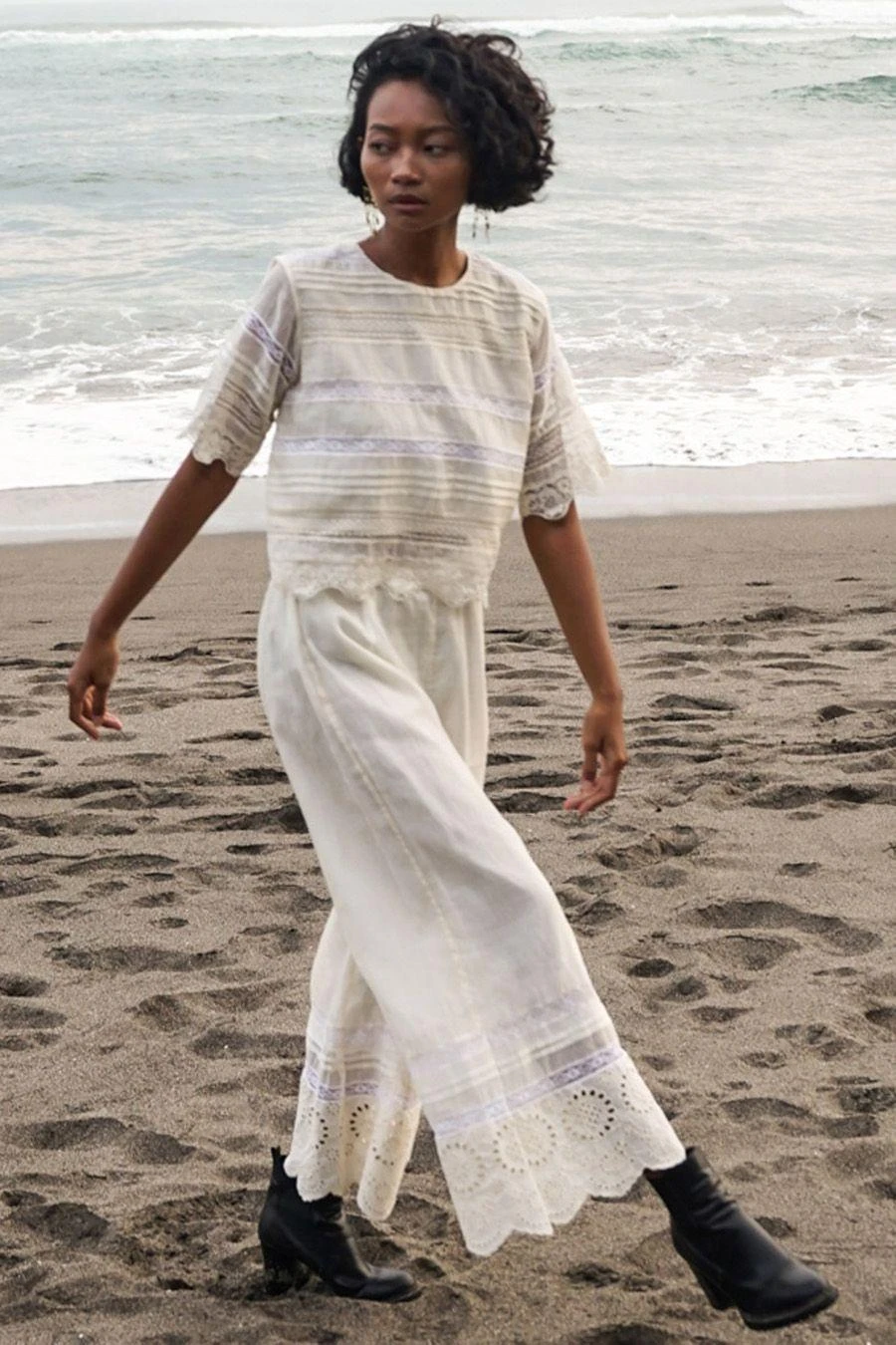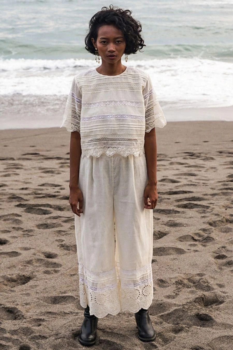 Crafted in chanderi cotton silk, these pants feature delicate laces with pintuck details and an attached tonal lining. Pair it with the Ivory Misha lace top from the collection to complete the set.