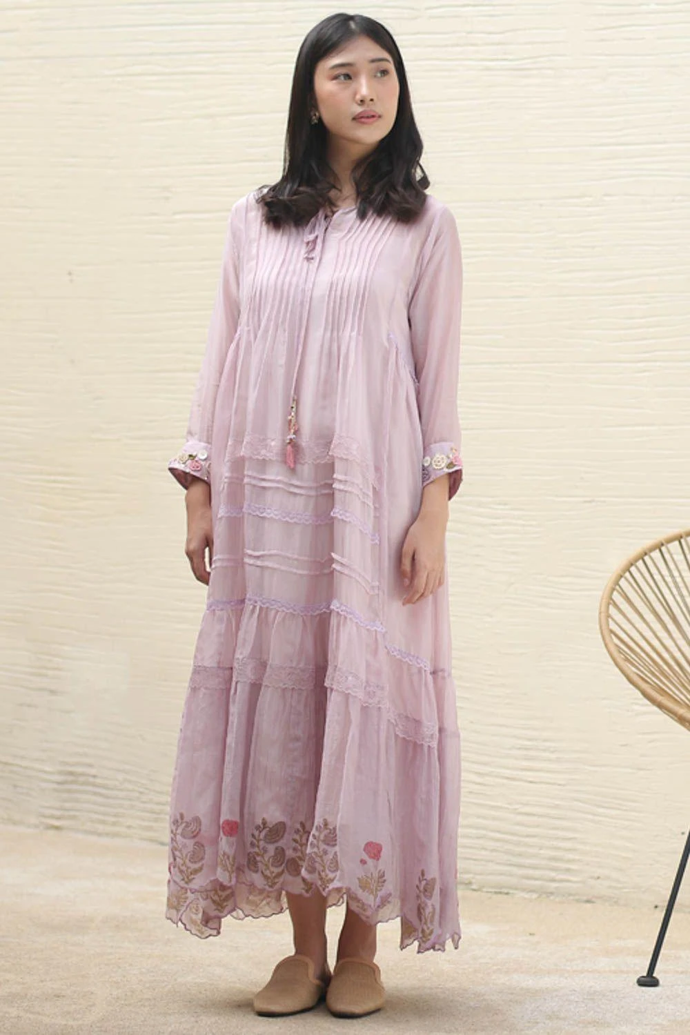 From your work desk to the brunch table & from lounging at home to catching flights, you can always count on this dress. Crafted in cotton silk, this lavender dress features pintuck & lace detailing with floral embroidery at the bottom.