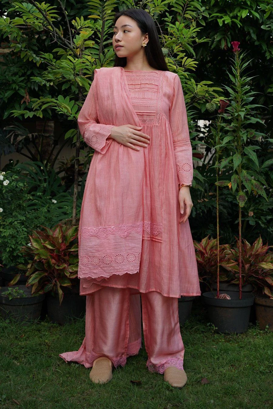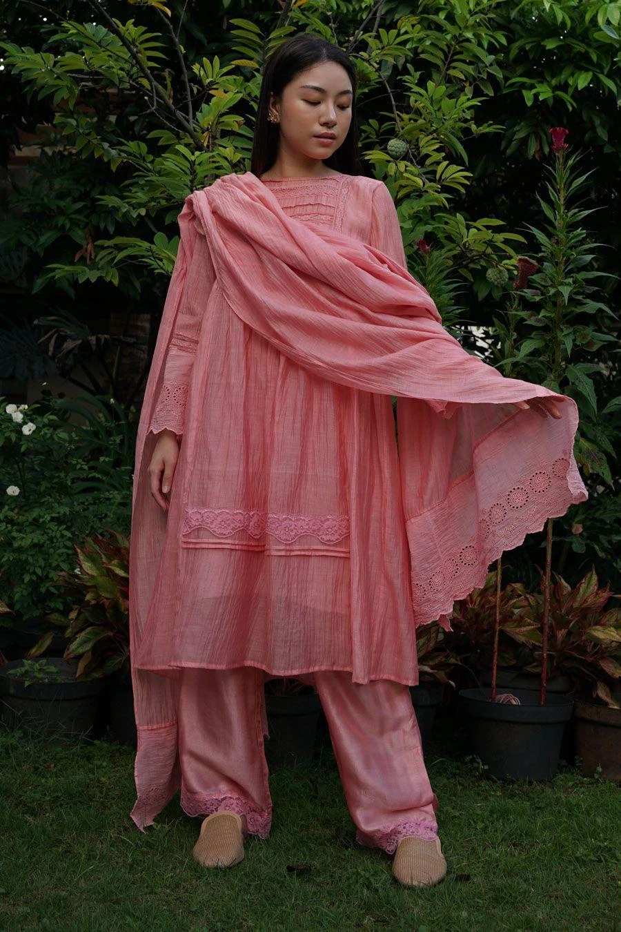 Take your layering game a notch higher with this pink dupatta. Crafted in chanderi cotton silk, this dupatta features delicate lace detailing with a tonal embroidery panel on the edges.