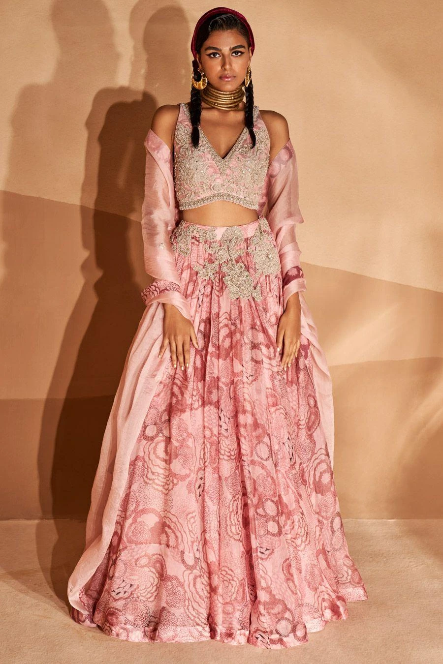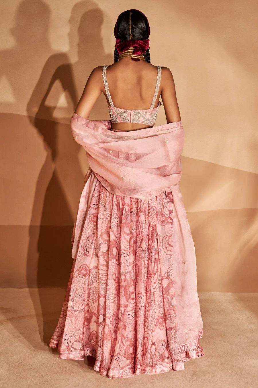 Look effortlessly stylish in this blush pink lehenga set. Crafted in organza, this set comes with a printed skirt with an embroidered waistline paired with an intricate embroidered nejma bustier and dupatta.