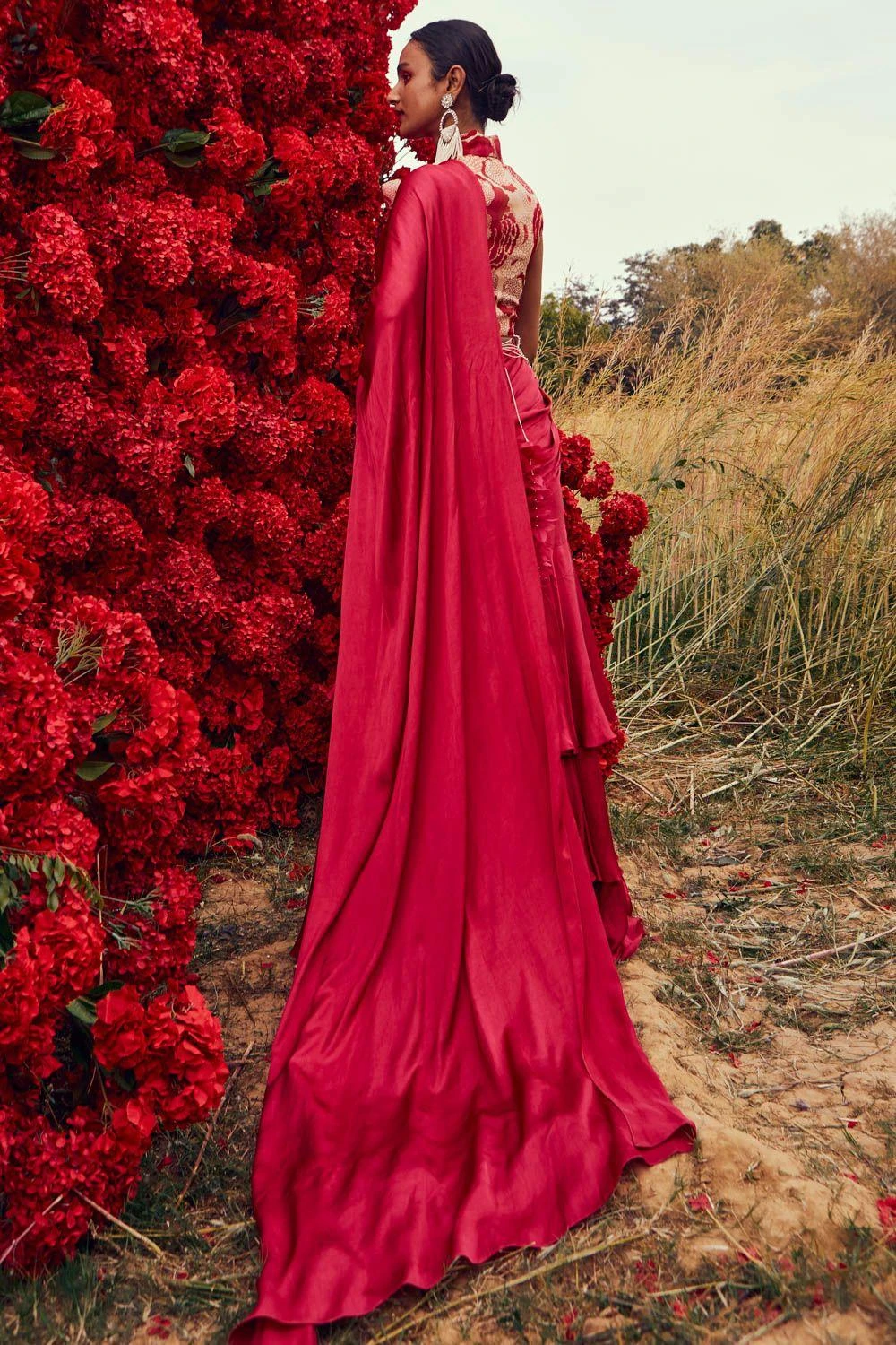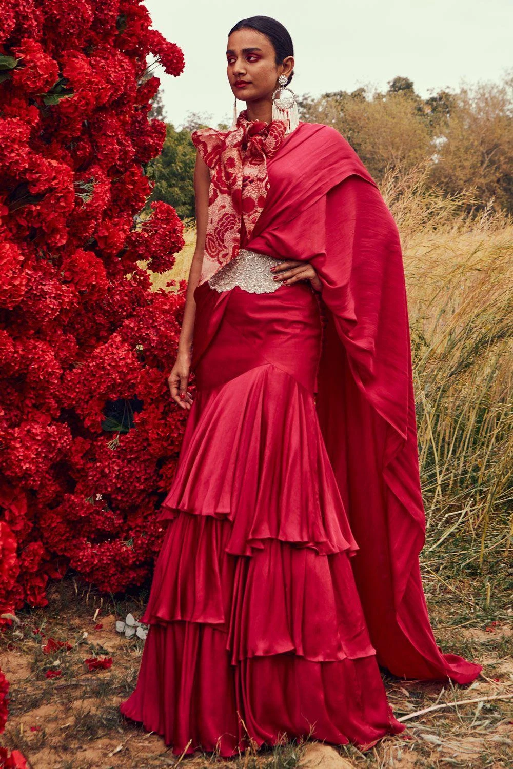 This vibrant fuschia sari is set in a crepe satin organza fabric. THis draped sari has a layered silhouette & comes with a belt. The blouse has floral printed details, making it perfect for daytime festivities.