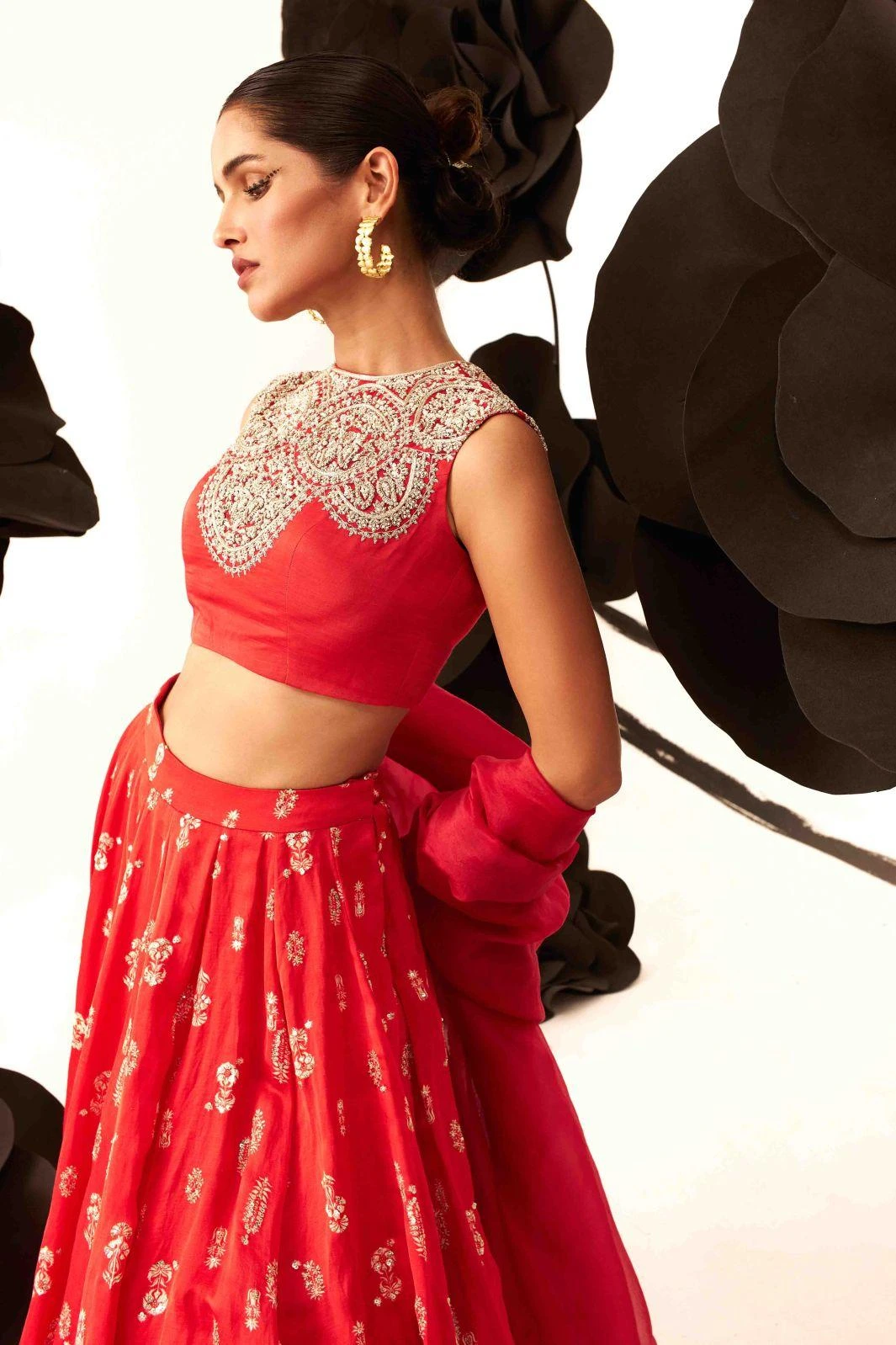 Radiate sophistication in this red floret skirt, gracefully paired with an embroidered blouse and a matching dupatta. This ensemble embodies timeless elegance and style.