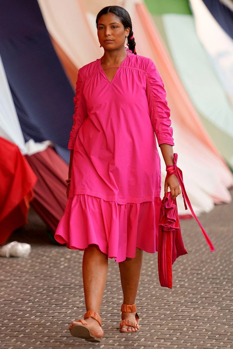 Designed with impeccable attention to detail, this dress features a pink hue, a flattering neckline & ruched sleeves that add a touch of drama. Crafted in cotton, this dress is perfect for any special occasion, making you feel confident & radiant.