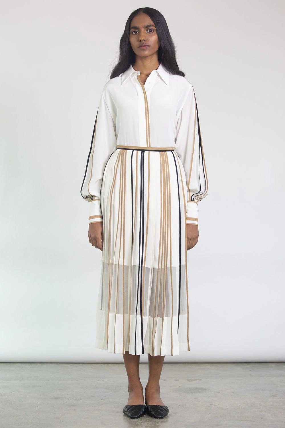 This one-of-a-kind pleated skirt represents our take on new-age contemporary. Multicolor binding on pleats and sheer organza panel gives a special character to the skirt. Wear it with a tucked in shirt and leather pumps for your birthday dinner.áá
