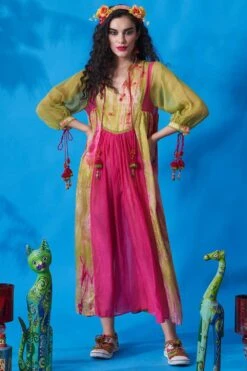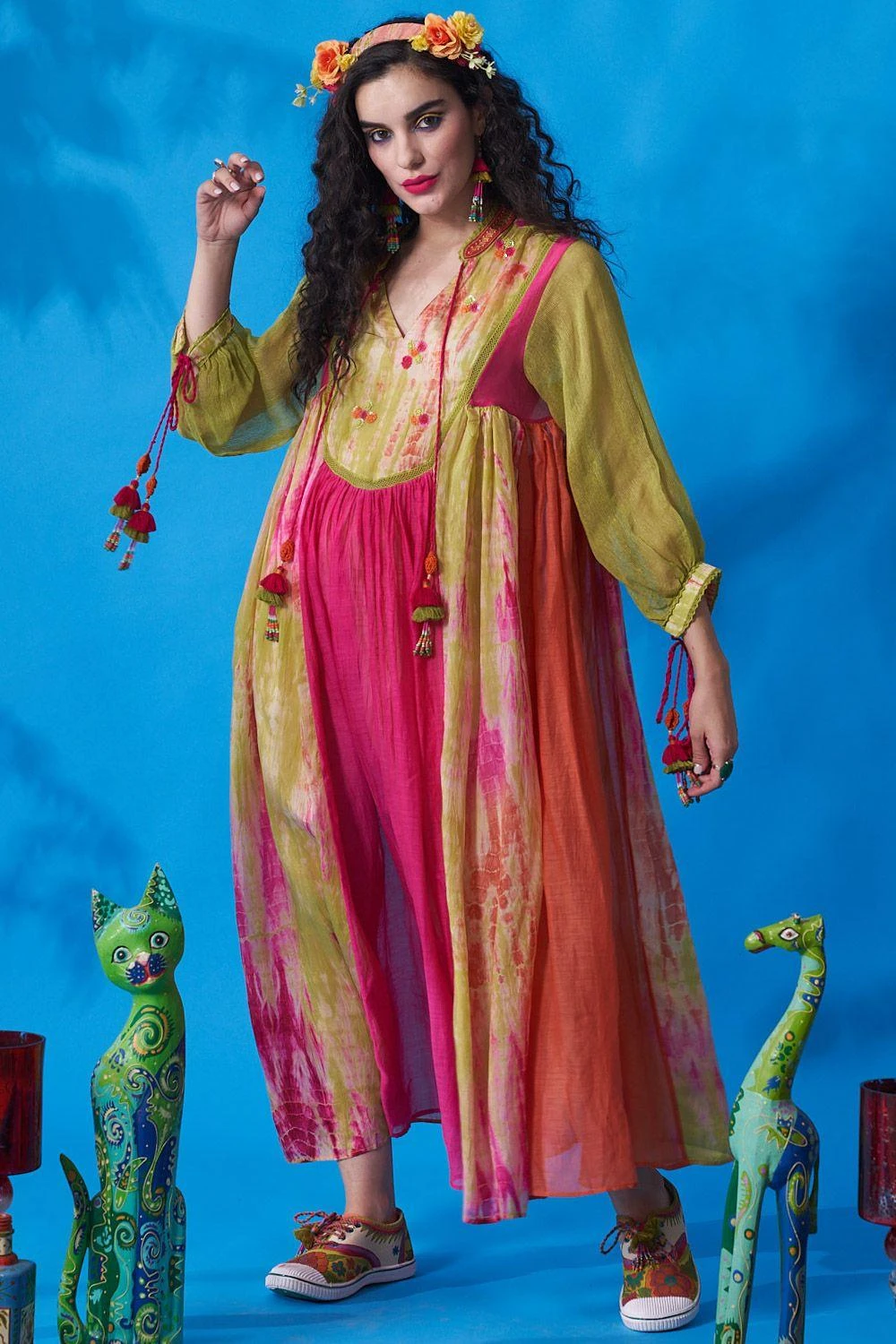 The perfect amalgamation of style & comfort, this dress is perfect for a day out. Cut in habutai silk, this flared dress features an embroidered band and yoke with jute sleeves. Style this dress with dainty jewellery to complete the look.