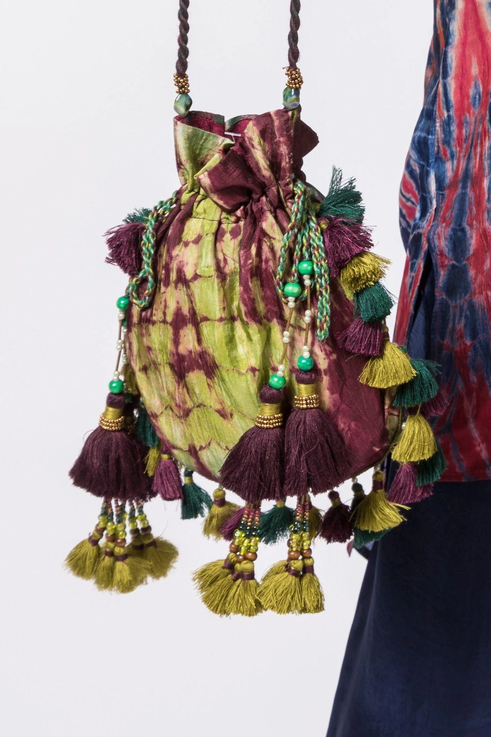 This green & wine tie & dye potli is the perfect accessory to add a bohemian touch to your look. The bag is made in habutai silk and accented with tassels.