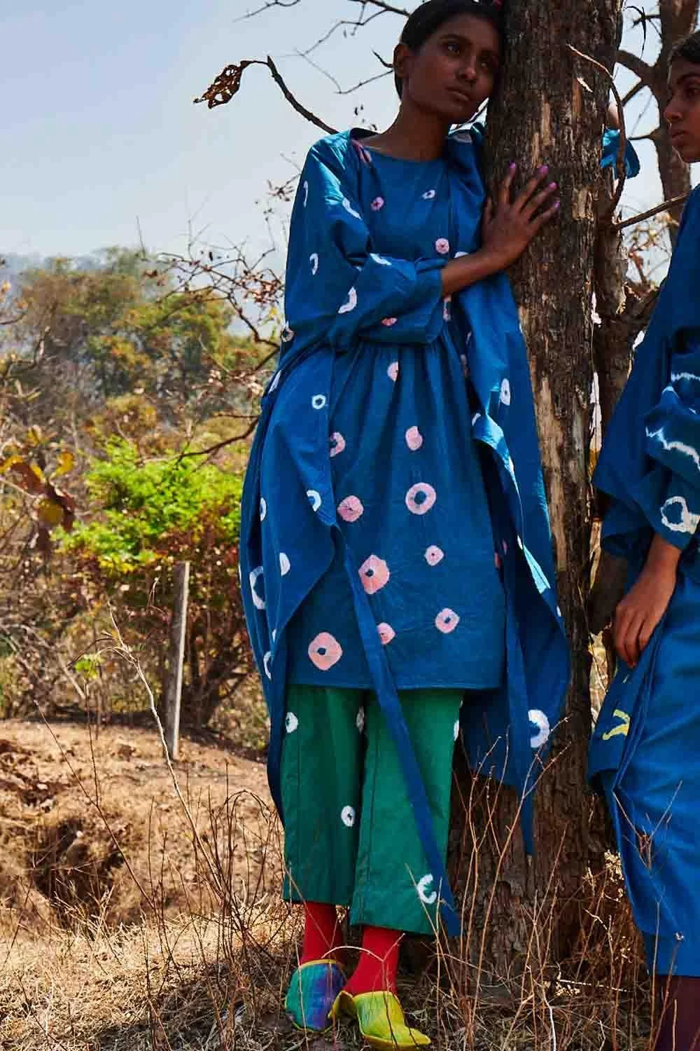 This flowy cotton dress is comfortable & playful piece, ideal for the season. This dress features bandhani dying technique which adds character to the minimal silhouette. Style it as is or pair it with coordinating pants from the collection.