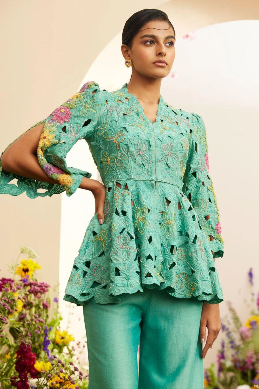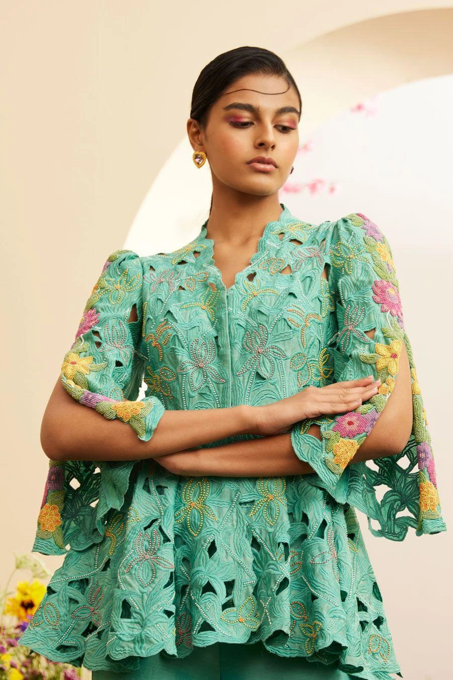 Maximise the life of your wardrobe with this aqua jacket. Crafted in chanderi, this jacket features intricate beadwork & cutwork details with split sleeves. Style it with the Aqua cutwork flared pants to complete the set.
