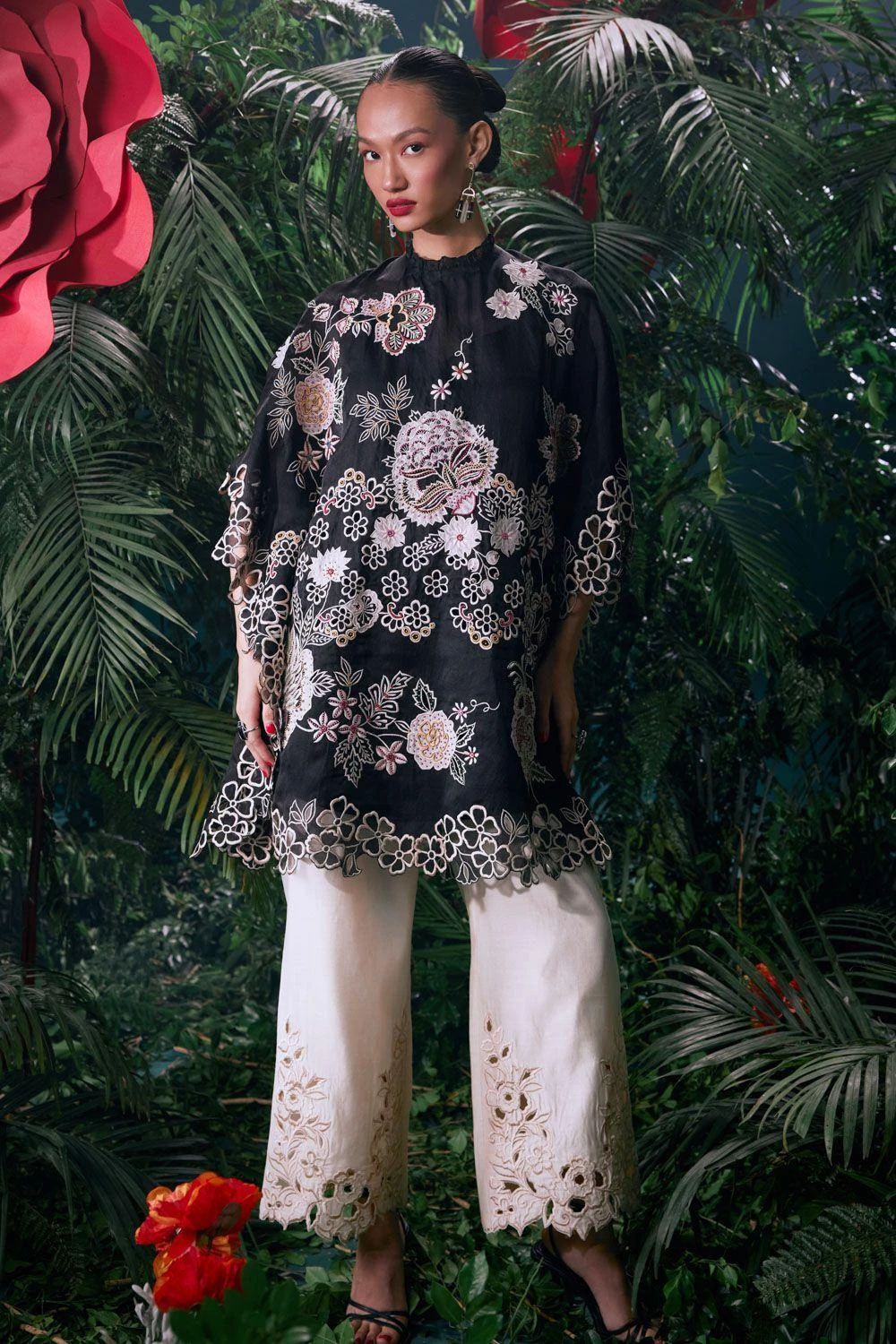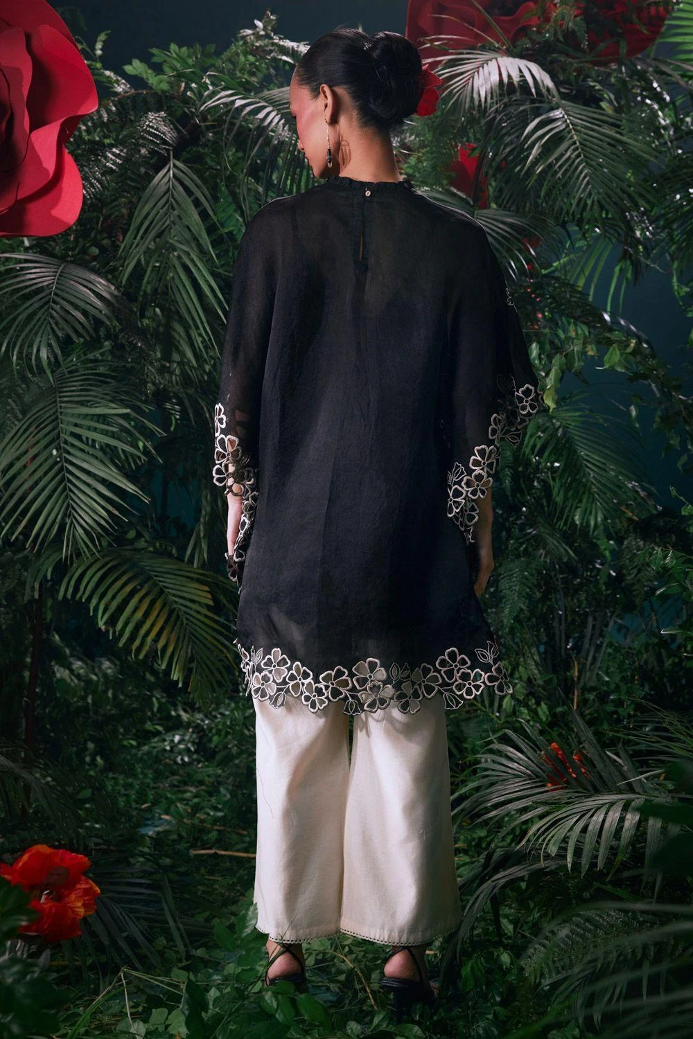 Step into the realm of elegance with this Black Organza Kaftan, adorned with exquisite cutwork and intricate beadwork. This ensemble is a masterpiece of craftsmanship and modern sophistication, redefining your style with an element of unique charm.
